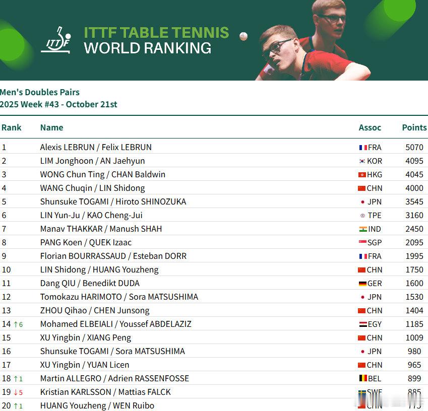 男单:王楚钦10900分、林诗栋位列前二,梁靖崑位列第7,向鹏位列第9