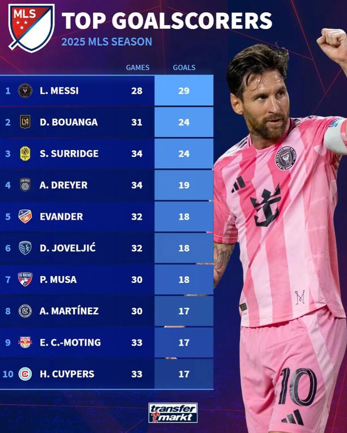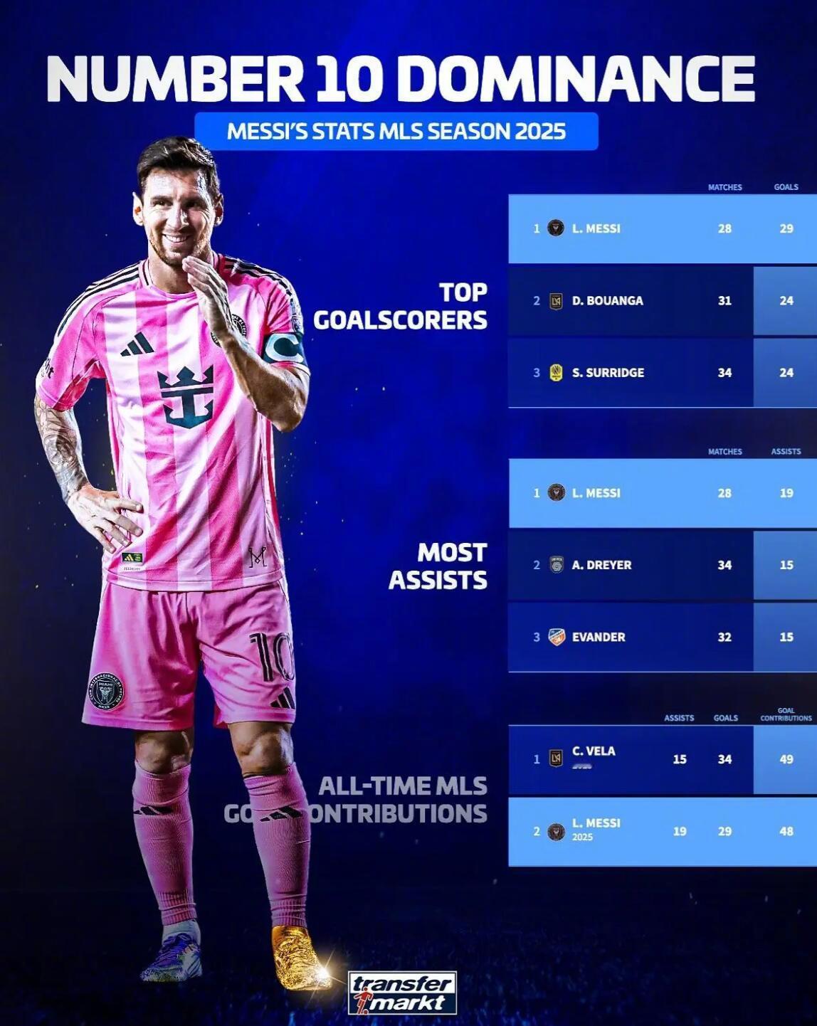 在本赛季的射手榜上,梅西以 28场29球 的成绩力压群雄,超越布昂加(24球)和苏里奇(24球),独占鳌头。同时,他还送出 19次助攻,同样位列全联盟第一,实现“进球+助攻”双料第一。
