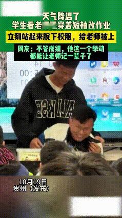 这孩子绝对靠得住!天气降温了,可视频中这位老师却穿着短袖,正在聚精会神地批改着作业。没过一会,一个男同学看了看老师,觉得老师这样下去会感冒的,于是他主动上去并脱了自己的校服,然后轻轻地给老师披上。 看到如此懂事又暖心的同学,老师会心一笑,接着站起来把校服穿好。两人虽然没说过多的话,但心意就在心涧之间流淌。对于学生,如此体贴关怀他人,为其他学生树立了好榜样,以后绝对靠得住,值得表扬更值得发扬。 对于老师,看到学生这么懂事,他第一时间用微笑待之,接着又穿好校服,这种以礼待人、为人师表的精神值得肯定。可以说,这是一种双向奔赴的师生情谊。最后,祝福这个同学学业有成,成为国之栋梁,也祝福老师身心健康,顺心如意。