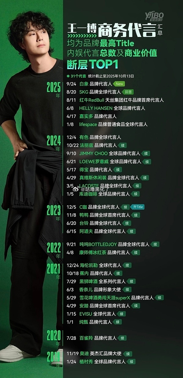 王一博今年续约了25个商务新增了6个商务总商务31连续六年第一,还有几个待宣