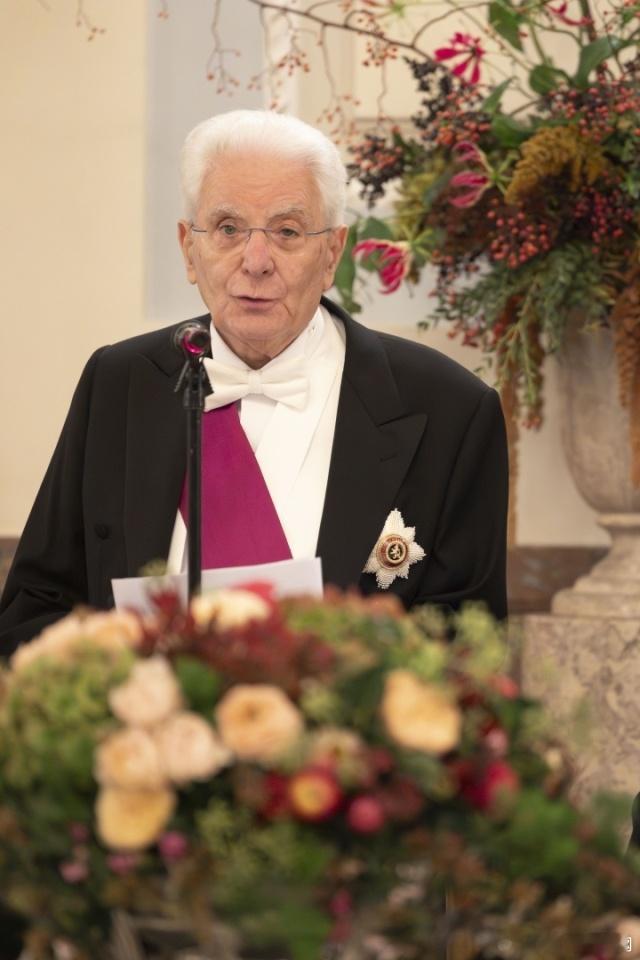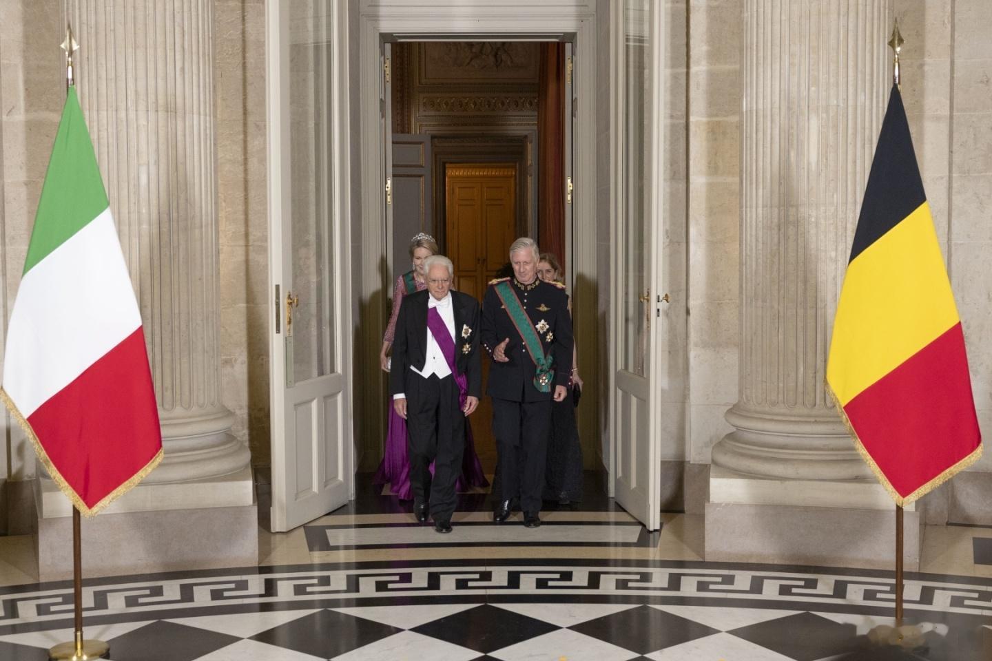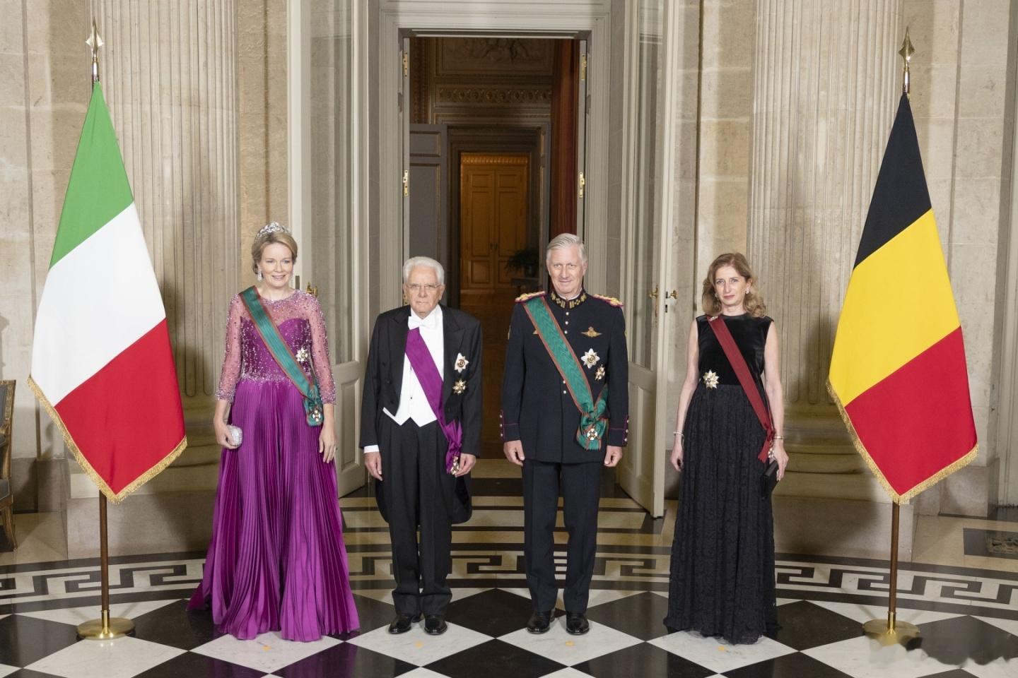 比利时王室 10月20日,意大利总统塞尔焦·马塔雷拉和第一女儿劳拉国事访问比利时王国,菲利普国王和玛蒂尔德王后为他们举办国宴,这次国宴阿斯特里德公主和洛朗王子也受邀出席。世界各国王室[超话] 王后的礼服也是旧的来自阿玛尼,王冠和珠宝就不谈啦。