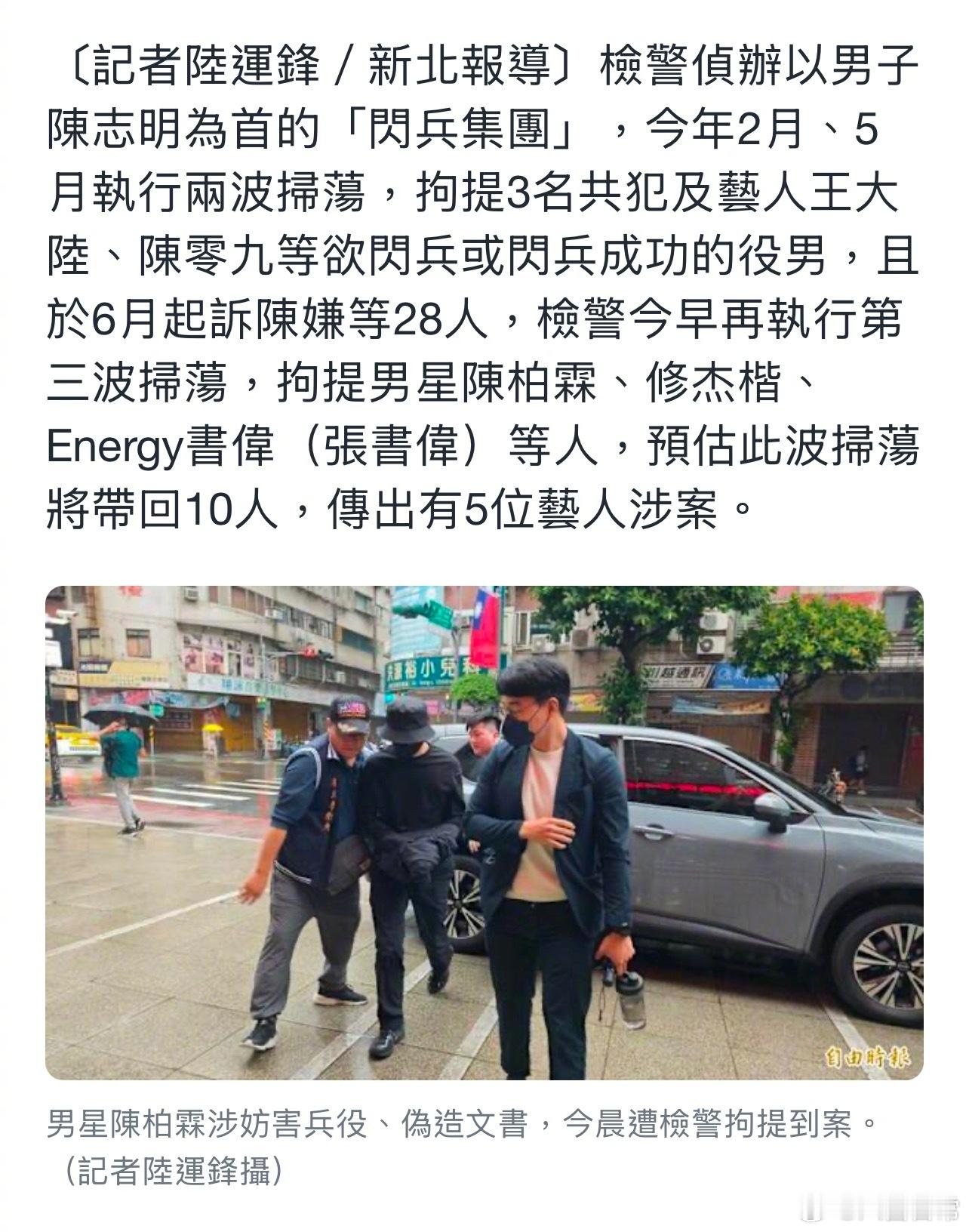 陈柏霖、修杰楷、Energy张书伟因涉嫌逃兵役,今天清晨被拘提配合调查