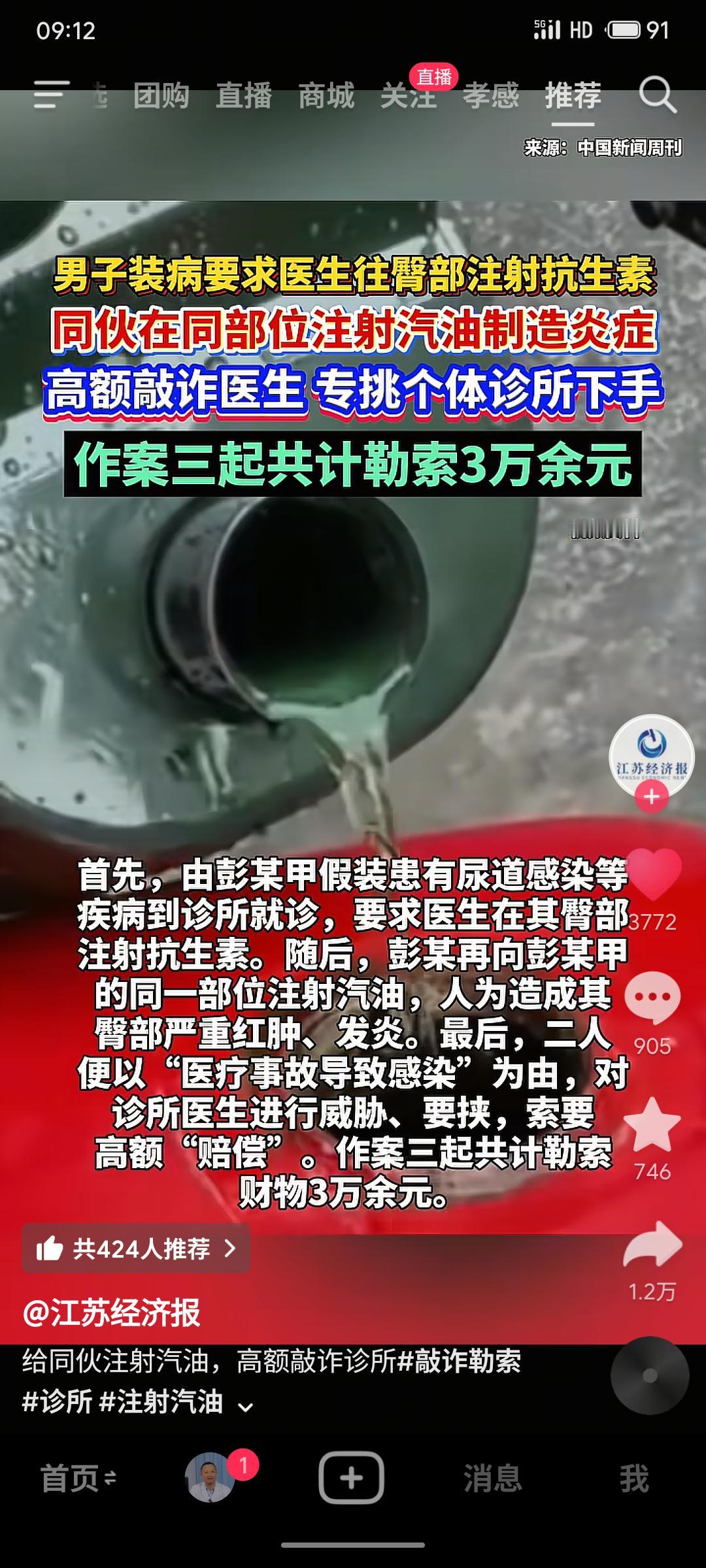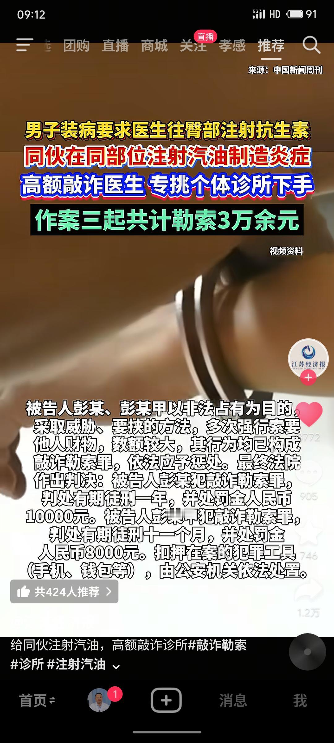 湖北两名男子彭某等人流窜鄂湘两省,专挑个体诊所实施敲诈:先由同伙假扮患者要求臀部注射抗生素,随后自行注射汽油制造严重炎症,再以“医疗事故”为由勒索。作案三起获利3万余元,最终分别被判处有期徒刑11个月至1年,并处罚金。