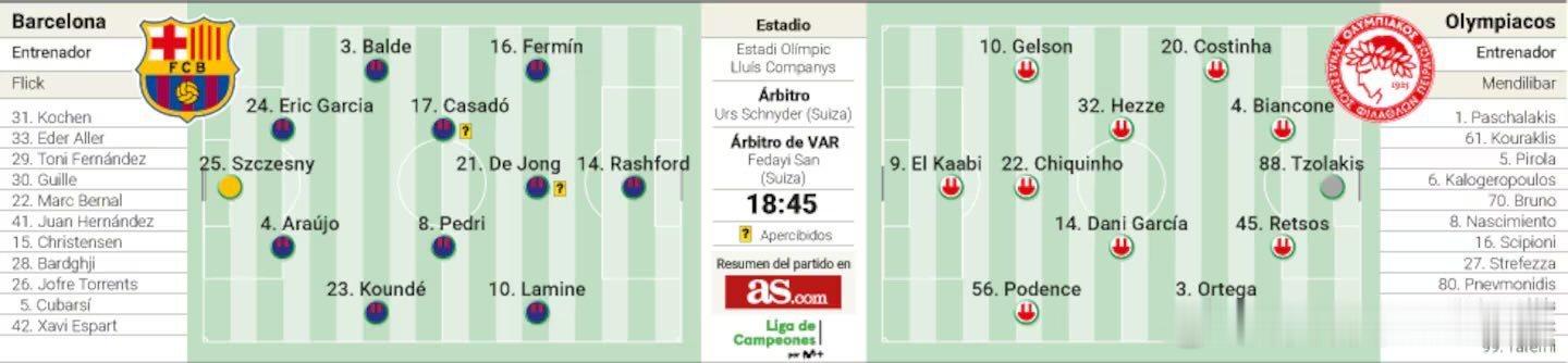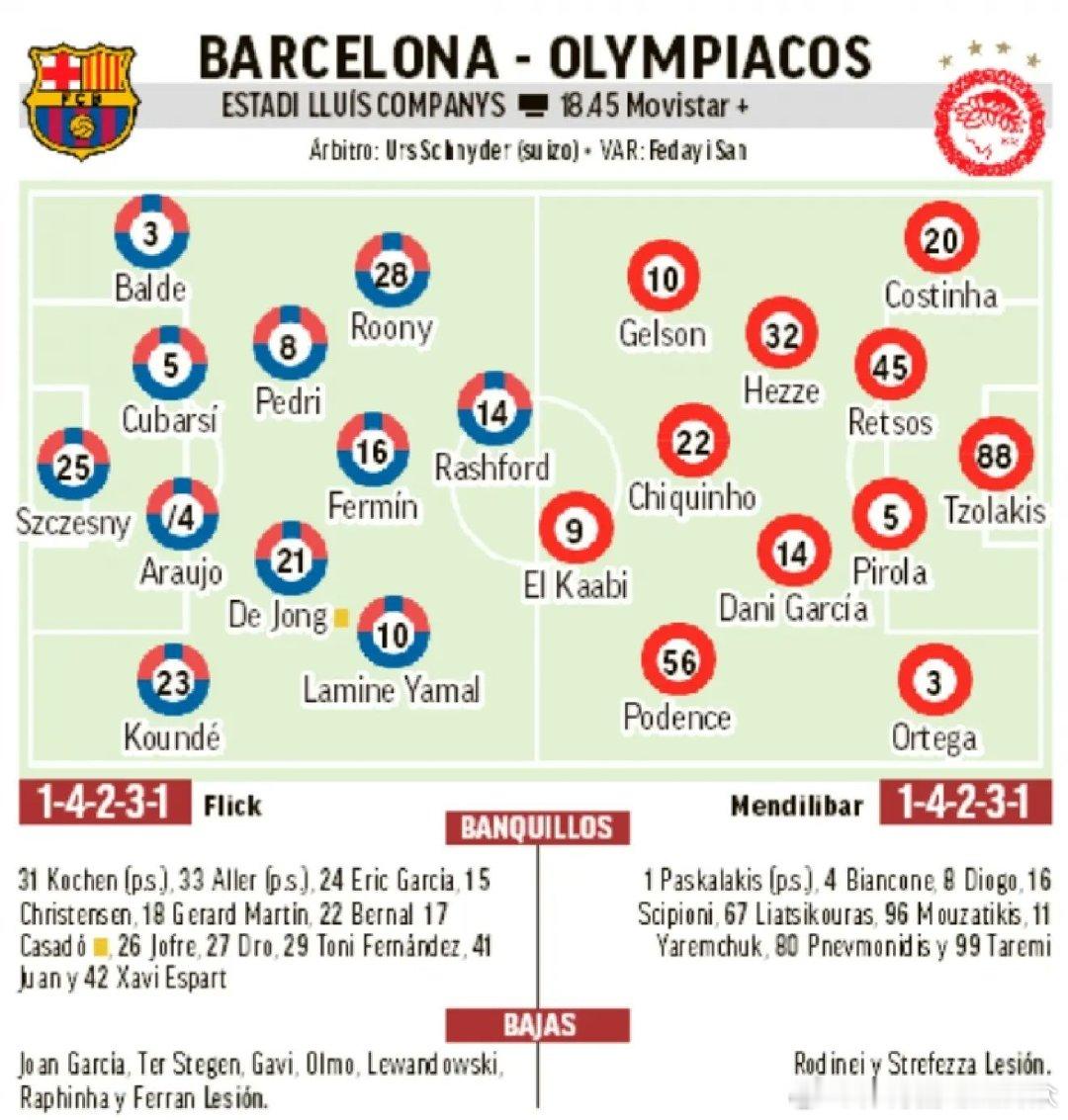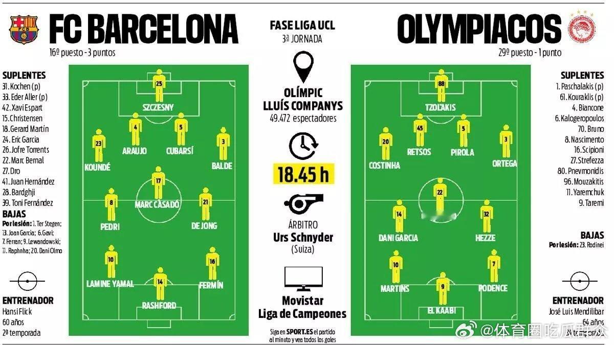 媒体预测巴萨VS奥林匹亚科斯首发阵容。巴萨欧冠联赛巴萨vs奥林匹亚科斯cr
