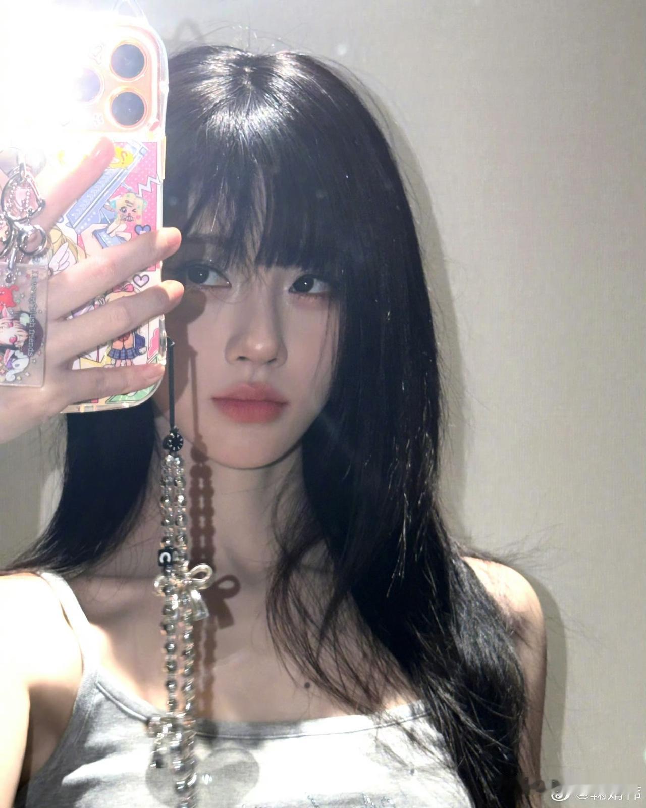 鞠婧祎终于放弃了她的的半永久妆 一改往日的轻盈碎发空气刘海,剪了齐刘海,配上黑长