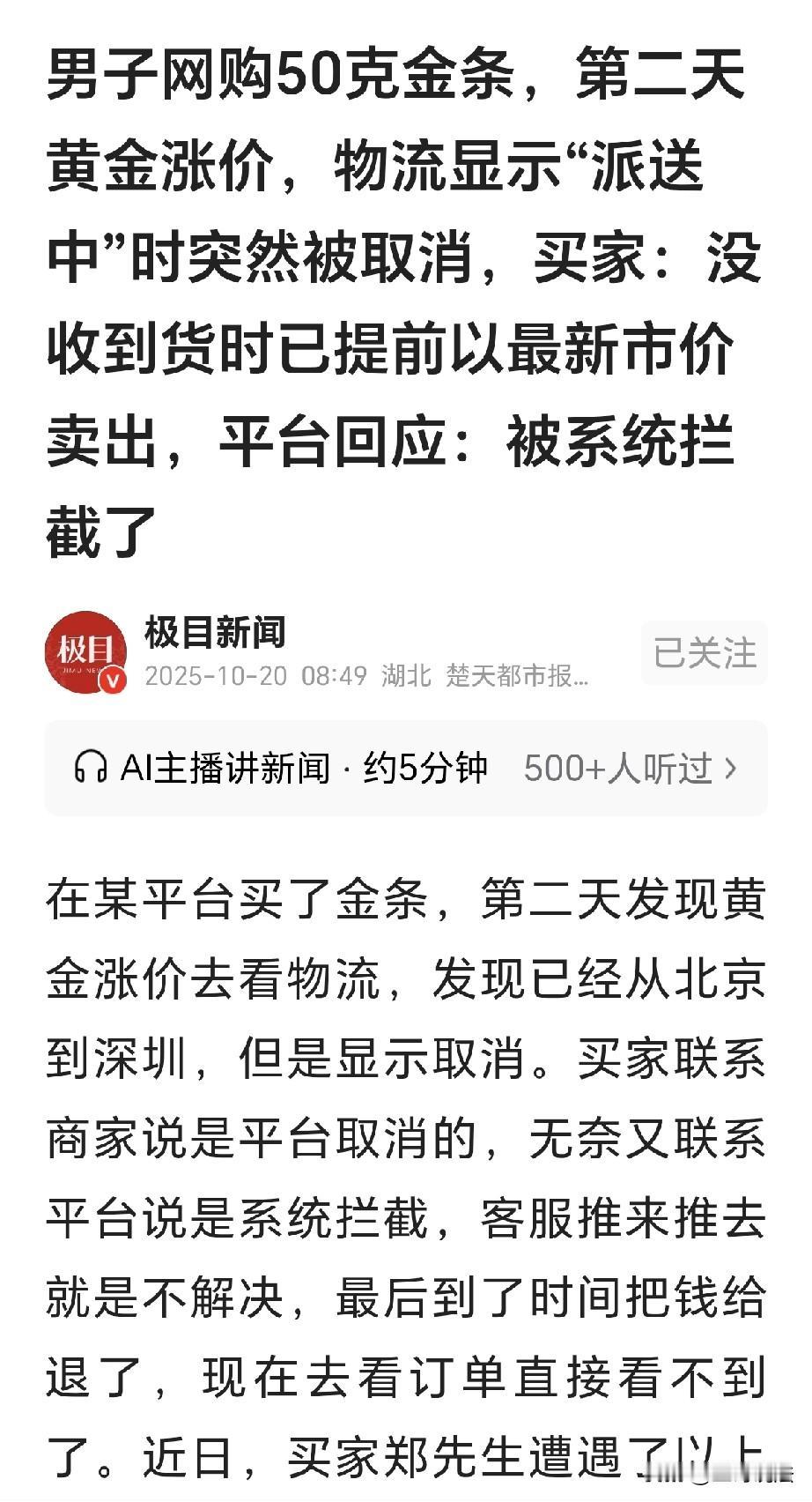 北京,一男子以900元/每克的价格购入50克的金条,金条还没收到,男子就按最新价转卖,谁知订单突然被取消了,就连购买记录都被一并删除,男子没法向买家交付,只有按940元/每克的高价,又买了一次,男子损失惨重,男子找平台立刻,平台愿意给他200元补偿,男子火冒三丈: 我要2000元补偿,还要说清楚为啥取消订单?为啥删除记录? 10月10日,郑先生在某购物平台闲逛,看到一家首饰官方旗舰店有卖黄金。 郑先生一看价格,非常划算,他立刻下单,以每克900.3元,下单买了一块50克的金条。 这根金条,总价45015元,郑先生付完钱后,突然发现收货地址选择不对。 于是他立刻改正,把收货地址,从北京改成了深圳。 在郑先生看来,修改地址就是正常操作,因为系统原本就有这个功能。 因为有些客户,会因为有多个收货地址,有时候会忘记转换,因此平台专门给客户留了修改的机会。 订单下了之后,郑先生在家静待着收货,谁知他刷新金价行情,发现黄金价格已经涨了。 郑先生心里高兴,还没收到金条,他就立刻联系到了买家,按照当天的市价把金条给卖了。 郑先生心想,这样就能赚取一笔不少的差价。 可到了10月11日,他打开购物平台,想查一查物流现在到了哪里。 可谁知郑先生一看,他直接傻眼,原本物流已经显示在派送,可郑先生突然发现,订单竟然被取消了。 郑先生急了,他除了更改过收货地址,啥也没做,更没有申请过退款,订单怎么会被突然取消? 郑先生赶紧找商家客服询问,但商家回复,说他们并没有权限取消订单,需要联系平台客服询问发生了什么。 郑先生心里着急,立刻找平台客服咨询,谁知平台客服告诉他说,他的订单是被系统拦截了。 客服还说,系统会综合判断用户的下单行为,收货信息,账号情况和购物历史。 如果系统判定,消费者购买的商品数量超过了正常生活消费需求,可能会损害其他普通用户的利益,系统就会自动拦截或取消订单。 最后,客服向郑先生提出建议,要他换个时间段,或者换个账号试试再看。 郑先生更加纳闷,我就是买了一根50克的金条,怎么就超过正常消费需求? 我就是改了个收货地址,难道这就算是订单异常? 他反复跟客服强调,自己是正常下单,要求恢复订单、解决配送问题。 但客服每次都说,会有专员跟进处理,让他耐心等消息,可是,郑先生并没有等来确定的回复。 从10月11日到10月13日,郑先生每天都联系平台客服,可问题依旧,压根不给解决问题。 郑先生将订单截图留存,以备以后不时之用,果然不出他所料,郑先生发现,这笔订单被取消之后,又从郑先生的购买记录中彻底删除。 这条订单如今毫无踪迹,就像郑先生从未下过订单一样。 郑先生又气又急,如果不是他预先存留了订单截图,如今就是有一百张嘴,也说不清楚。 10月14日,因为订单超时,45015元退回到了郑先生的账户。 郑先生接到了平台电话,平台愿意给他200元作为补偿。 可这点补偿,根本没法弥补郑先生的损失,因为他已经把金条提前卖了。 现在订单取消,而他手里没货,为了保住自己的诚信,他只能按照涨价后的价格,重新买了一根金条给他的客户。 而他购买时的金价,已经涨到了940元/克,计算下来,他重新买50克金条,要多花2000元左右。 因此算来,平台只给200元的补偿,远远的不够,郑先生亏得太多,他不接受。 郑先生提出要求,要平台赔偿他2000元损失,另外,平台要清楚说明,为何要拦截他的订单,又为何要删除他的订单记录? 记者听到郑先生的遭遇,10月17日,记者联系平台客服,想了解一下具体情况。 但客服表示,他们不予答复,关于郑先生的订单,只能由郑先生本人前来沟通。 客服拒绝向记者透露任何信息,即便记者提供订单编号,他们也无法给予答复。 那么,这件事在法律上是怎么认定的呢? 《民法典》第491条规定: 当事人一方通过互联网等信息网络发布的商品或者服务信息符合要约条件的,对方选择该商品或者服务并提交订单成功时合同成立,但是当事人另有约定的除外。 商家在平台挂出明确价格900.3元/克和规格50克的金条,属于要约。 郑先生提交订单并付款,即完成承诺,此时买卖合同已生效。 平台以超出正常消费需求为由取消订单,但未给出明确标准,50克金条并非大额采购,平台不能单方取消订单。 《民法典》第577条规定: 当事人一方不履行合同义务或者履行合同义务不符合约定的,应当承担继续履行、采取补救措施或者赔偿损失等违约责任。 平台在物流派送阶段拦截订单,属于“不履行合同义务”,构成违约。 郑先生的2000元差价损失,是因平台违约直接导致的,平台仅赔200元明显不足,应按实际损失赔付。 另外,消费者有知情权,平台必须说明删除记录和拦截订单的理由。 关注@王哥说法 多学法律少吃亏!