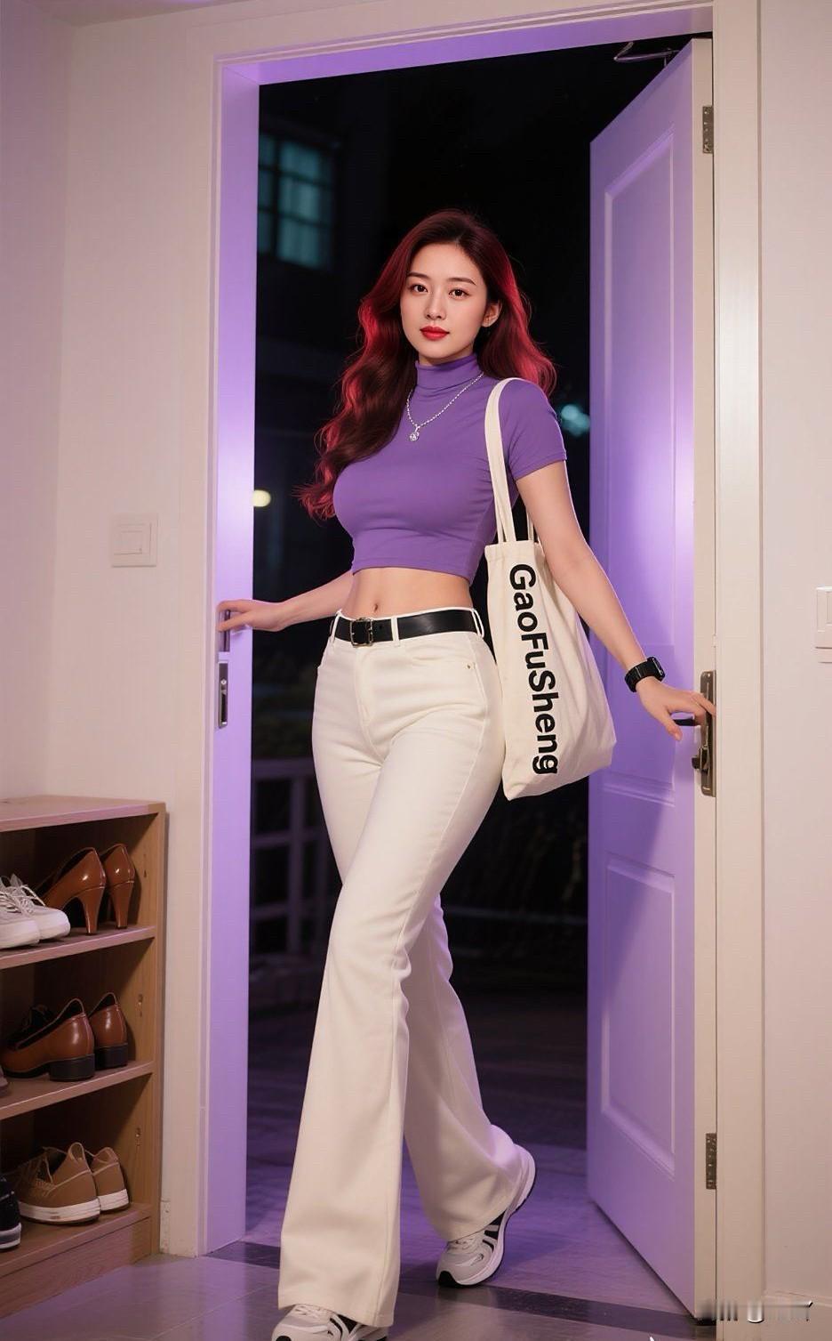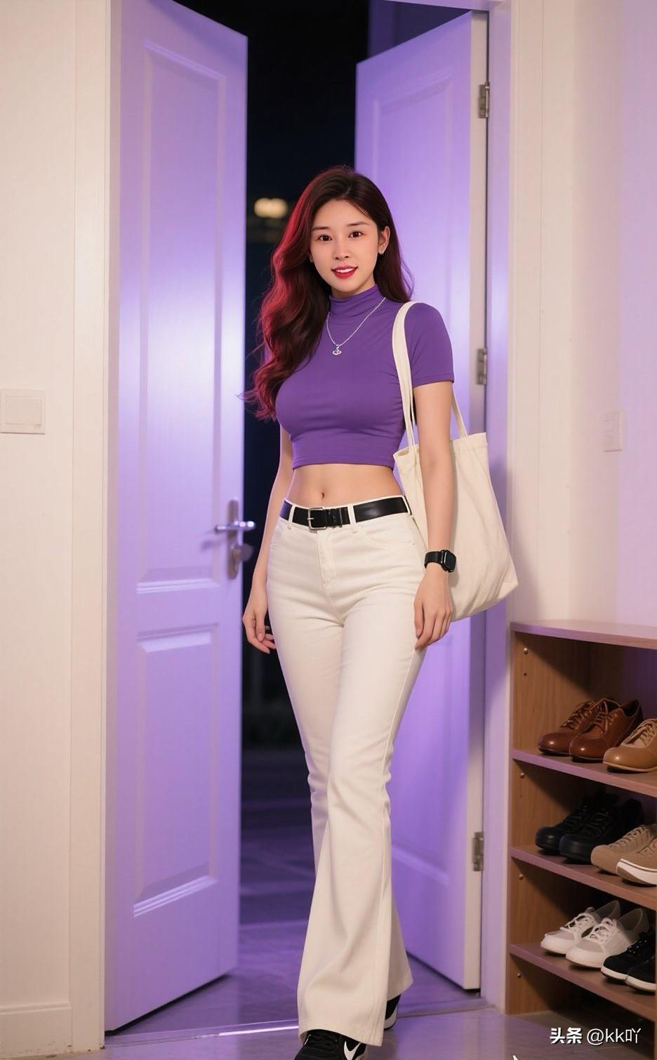 紫色短款上衣搭配米色高腰裤,简约时尚,尽显青春活力!紫色裙子穿搭米色系穿搭紫