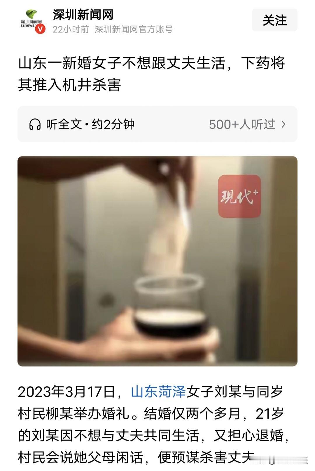 “比潘金莲还狠!”山东菏泽,21岁女子,新婚2个多月,她不想跟丈夫生活,又怕退婚父母被人说三道四,在丈夫喝酒后给他吃安眠药,连哄带骗让丈夫下机井捞鱼,不料,丈夫下井时坠入机井,4次求妻子找人救命,可女子开车往返多次,却没找人救他,之后,女子还将井盖盖上,丈夫最终因为缺氧窒息呼吸衰竭死亡,而法院判决让人拍手称快! 2023年3月17日,21岁的刘某和小伙子柳先生(化姓)举办了一场热热闹闹的婚礼,谁也没想到,这桩婚事最终却以悲剧收场。 柳先生和刘某同岁,原本小夫妻应该恩爱有加,可是,新娘刘某却不喜欢丈夫,看他哪都不顺眼。 结婚短短两个多月,刘某也没有和柳先生培养出感情,她不想和丈夫共同生活,这种想法愈演愈烈,可她还有一丝担心。 刘某担心,如果自己和柳先生退婚,那么在村里父母会被人家说闲话的。 一方面她想退婚,一方面又怕父母被村里人说三道四,于是,刘某的脑海里产生了一个可怕的念头,他想杀了丈夫柳先生。 同年5月28号这天,柳先生和妻子刘某说,第二天他要去岳父母家吃饭。 刘某听了之后,眼前一亮,她想到了一个谋害丈夫的主意,那就是趁着丈夫喝完酒之后,给他吃上安眠药,然后,再把丈夫推下机井里淹死他…… 此时的刘某一心只想着丈夫是一个大麻烦,可是,她没有考虑到就算她不想与丈夫共同生活,也可以好聚好散,而不是谋害他的生命。 然而,刘某已经鬼迷心窍,一心想谋划着这件事,在第二天也就是5月29号,她跑药店买了一盒复方地西泮片,准备开始实施计划。 刘某一开始撒谎和丈夫说,她要找一个机井,往里面抛硬币解梦,让柳先生陪着她一起去外面找机井。 5月29日晚上,柳先生如约去了岳父母家吃饭喝酒。 晚上9点20分左右,刘某开着车将丈夫载上回自己家,中途,刘某假意关心丈夫说给他吃个解酒药,实则将她事先买好的6片复方地西泮片哄骗柳先生吃了。 刘某给丈夫喂完药之后,开着车没有返回家中,反而将车来到了之前找到的机井旁边。 晚上10点多,刘某把车停在机井边上,连哄带骗让柳先生下车,到了井边后,又强迫他下井捞鱼。 柳先生喝了酒又加上吃了药,迷迷糊糊的,对妻子的话也没有一丝怀疑,就下了井。 而这时的刘某压根没有阻止,她只有一个心思,就是想让丈夫坠入井中淹死。 柳先生听了妻子的话,下了井,没想到,下井过程中坠入了井中…… 柳先生坠入井中,吓得半死先后4次大喊求妻子刘某快去找人救自己。 刘某还真就开车走了,她确实数次开车往返,但是,她就是没有找人去救坠入井中的丈夫。 一直到了次日凌晨2点多,刘某觉得差不多了,她把机井盖给盖上了,装作什么都没发生,逃离了现场。 可怜的柳先生也许在最后时刻,他还在等妻子能找人来救自己,等那渺茫的生存希望,最终,柳先生因缺氧窒息呼吸衰竭而死。 刘某的一时私心,害了丈夫,也害了自己,酿成了两个家庭的悲剧。 不知道刘某到底怎么想的,不想一起生活,也有别的办法呀,她可以出去打工呀,不回家也是一种方式,为什么一定要把人害死呢?这有多么的深仇大恨呀,才一共结婚两个多月,真不知道这女的当时是咋想的,一定要置对方为死地,也不想想你自己杀的人能跑的了吗? 俗话说一人不进庙,二人不看井,三人不抱树,还有甜言蜜语必有求,催办急事必有鬼。 这个男人一定非常爱他的妻子,即使是喝了酒,哪怕是在晚上,还要下机井去捞鱼,但是万万没想到,他的老婆比蛇蝎还毒,可怜了她的丈夫对她那么信任。 最终,刘某也为自己的残忍行为付出了代价。 那么,法院会对刘某的恶劣行为怎么判呢? 刘某的犯罪行为非常恶劣,她为了自己的私利,精心策划并实施了杀害丈夫的行为,手段残忍。 《刑法》第232条规定:故意杀人的,处死刑、无期徒刑或者十年以上有期徒刑;情节较轻的,处三年以上十年以下有期徒刑。 刘某已经21岁,达到了刑事责任年龄,她因为不想和丈夫共同生活,又怕退婚遭村民说父母闲话,就产生了杀害丈夫的念头,这是典型的主观故意。 而且,她积极追求丈夫死亡的结果。 在客观方面,刘某精心策划,先购买安眠药,然后哄骗丈夫服用,再连哄加骗又强迫丈夫下机井捞鱼。 而且,在丈夫坠井后,刘某多次驾车往返却不施救,最终导致丈夫因缺氧窒息致呼吸循环衰竭死亡。 刘某这一系列行为非法剥夺了丈夫柳先生的生命,侵犯了丈夫的生命权,完全符合故意杀人罪的构成要件。 2025年9月26日,刘某被执行死刑。 关注@福康说法 从日常点滴学法律,生活安稳更有底