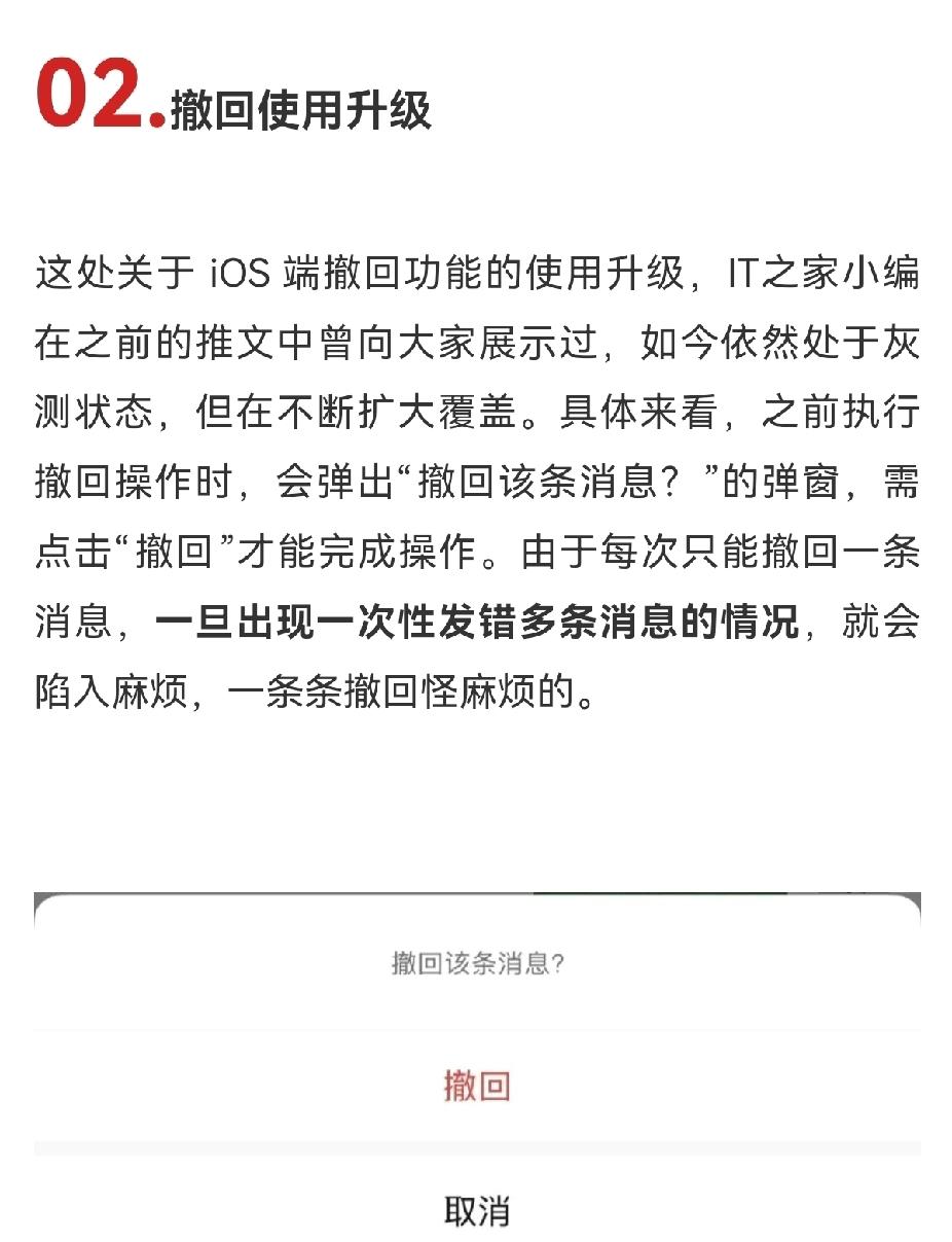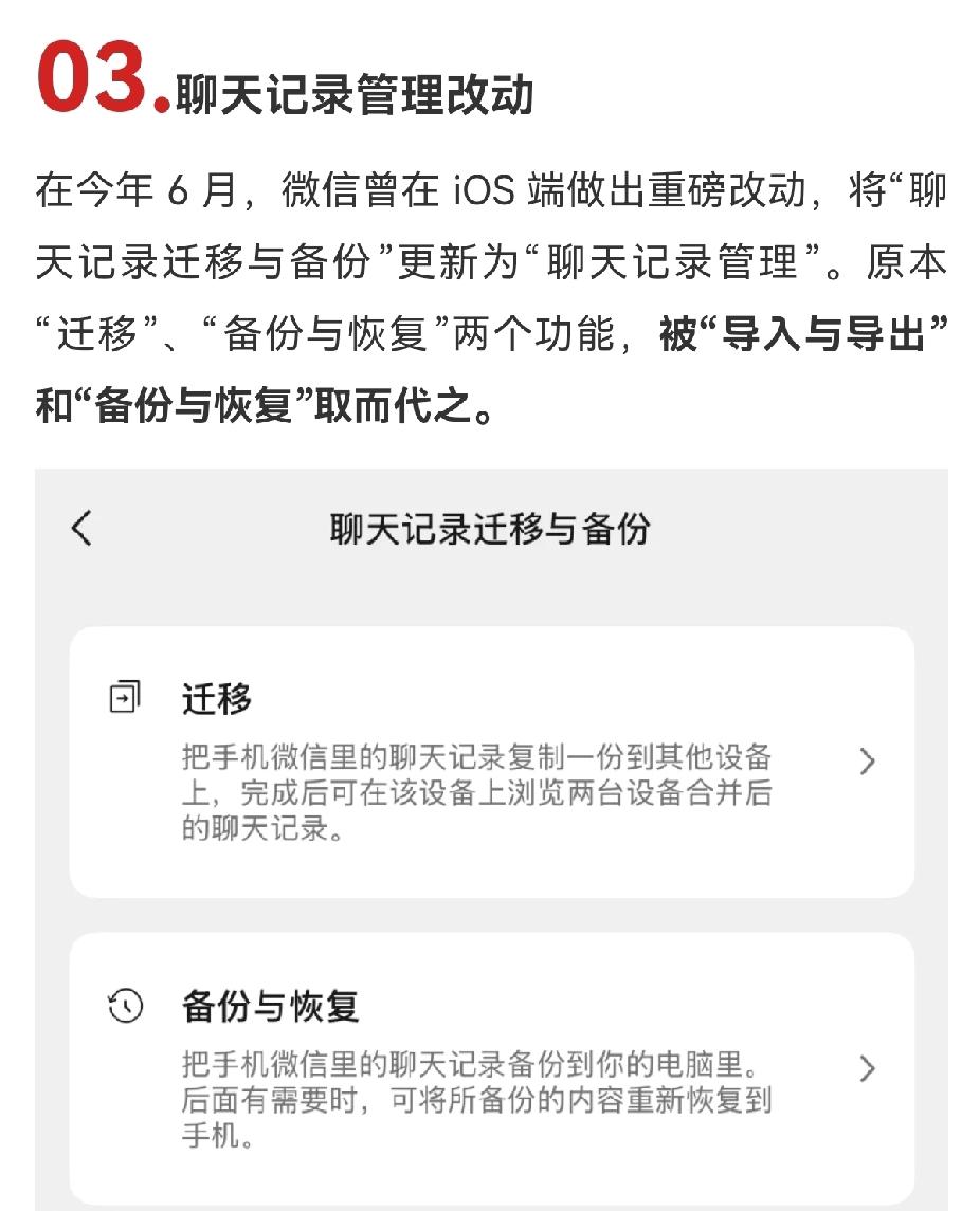 微信又双叒更新啦!这次的更新简直是广大网友的救星呀 第一个功能是群聊消息免打扰优化。以前,就算你开启了群聊免打扰,还是会被@所有人或者@你的消息烦死,特别是那种被莫名拉进去的广告群,简直防不胜防。现在好了,微信把群聊的“消息免打扰”升级了,你可以把@我、@所有人和群公告的通知都关掉,这样就能真正做到群聊彻底勿扰,世界一下子就清净了! 第二个功能是撤回使用升级。平时我们发错消息,得一条一条地撤回,手忙脚乱的,要是发错了好几条,更是让人着急。现在,微信在聊天框中长按发送的消息点击“撤回”时,会出现“撤回该条消息”和“撤回本次发送的全部消息”两个选项,只要在2分钟内,你就可以一键撤回本次连续发送的多条内容,再也不用担心“社会性死亡”了! 还有一个功能是聊天记录管理改动。之前iOS端的“聊天记录管理”功能现在安卓端也有了,你可以把聊天记录导入导出到其他设备,还能备份到电脑、U盘等存储设备,这样就能轻松管理你的微信存储空间,再也不用担心微信占太多内存啦! 不得不说,微信这次的更新真的是太贴心了,每一个功能都说到了我们的心坎里。大家快去看看自己的微信有没有这些新功能吧!如果有,别忘了在评论区分享一下你的使用体验哦!微信更新