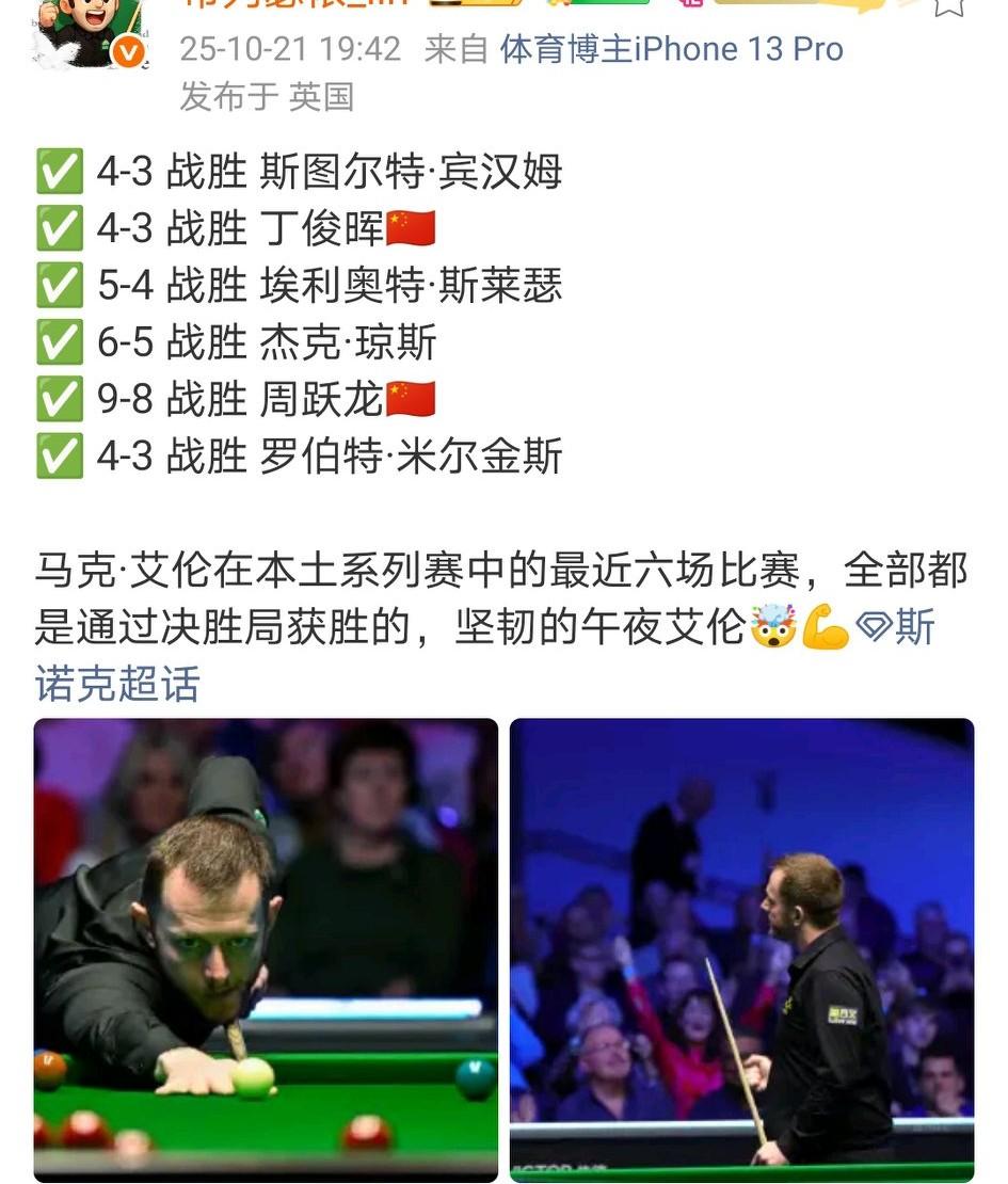 4-3!大心脏!马克艾伦又一次绝杀对手,他为何被称为“绝杀王”?本赛季已经有6次通过决胜局取得胜利。 25英格兰公开赛,4-3绝杀丁俊晖(0-3落后情况下翻盘) 25英格兰公开赛,9-8绝杀周跃龙夺冠 ……