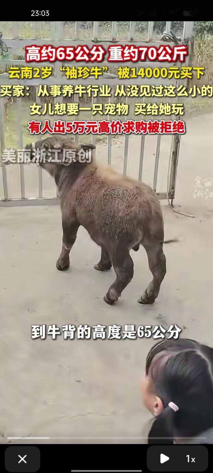 10月21日,丽江市永胜县。两岁“袖珍牛”被原主人以14000元售出,买家称将作为宠物给女儿饲养。该牛体重仅70公斤,肩高不足成人膝盖,大小与大狗一般,视频发出后,引起不少网友的关注。小牛新主人马先生表示,不少网友私信想买,但是我都没卖,因为小姑娘比较喜欢它。 专家分析,此类袖珍牛属基因突变的自然造化,虽稀有但确实存在。如今,它摇身变为行走的网红景点,用实力证明天生不同也能活为传奇。