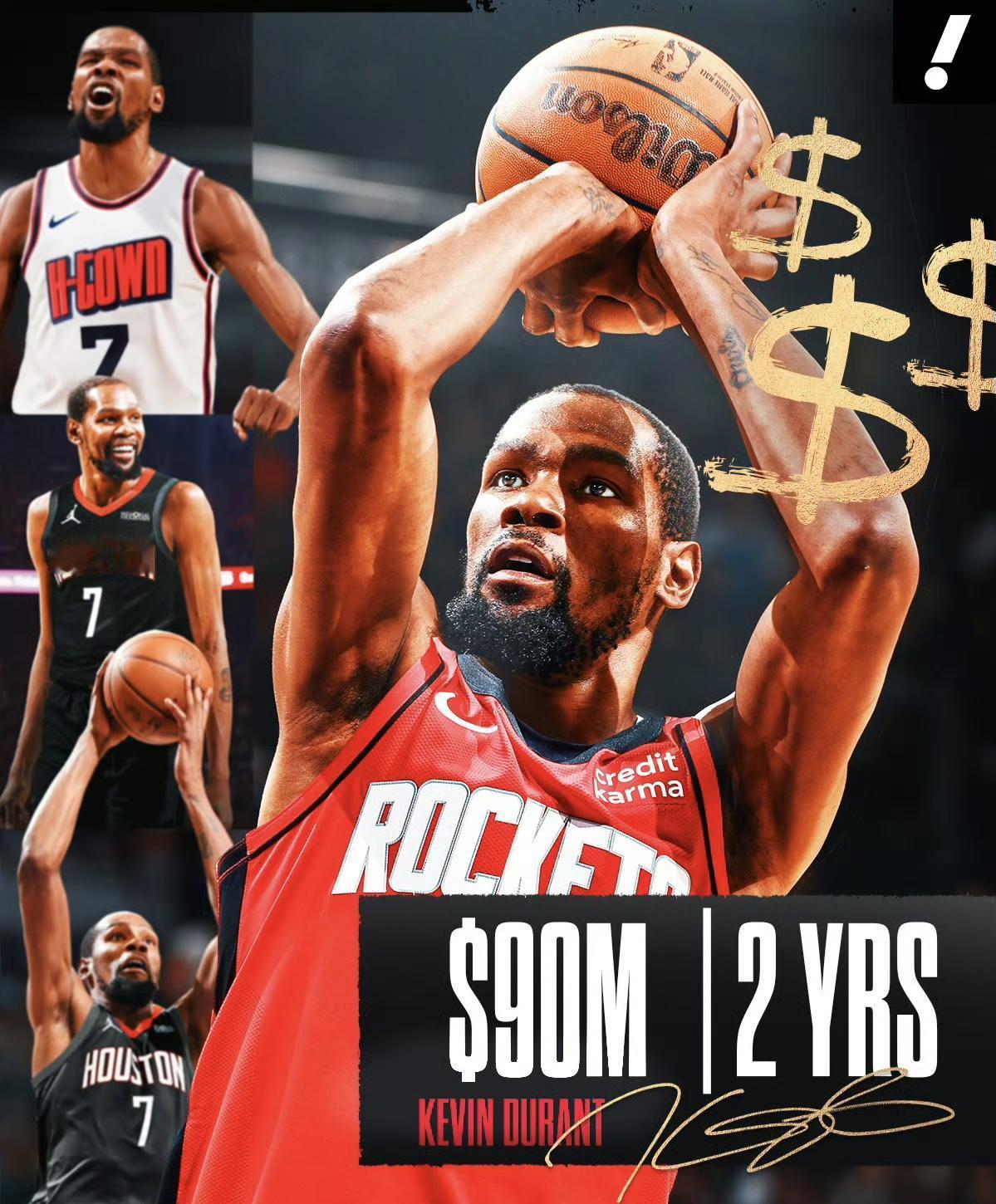 杜兰特降薪给了所有人体面! 杜兰特与火箭续下一份两年9000万的合同,最后一年球