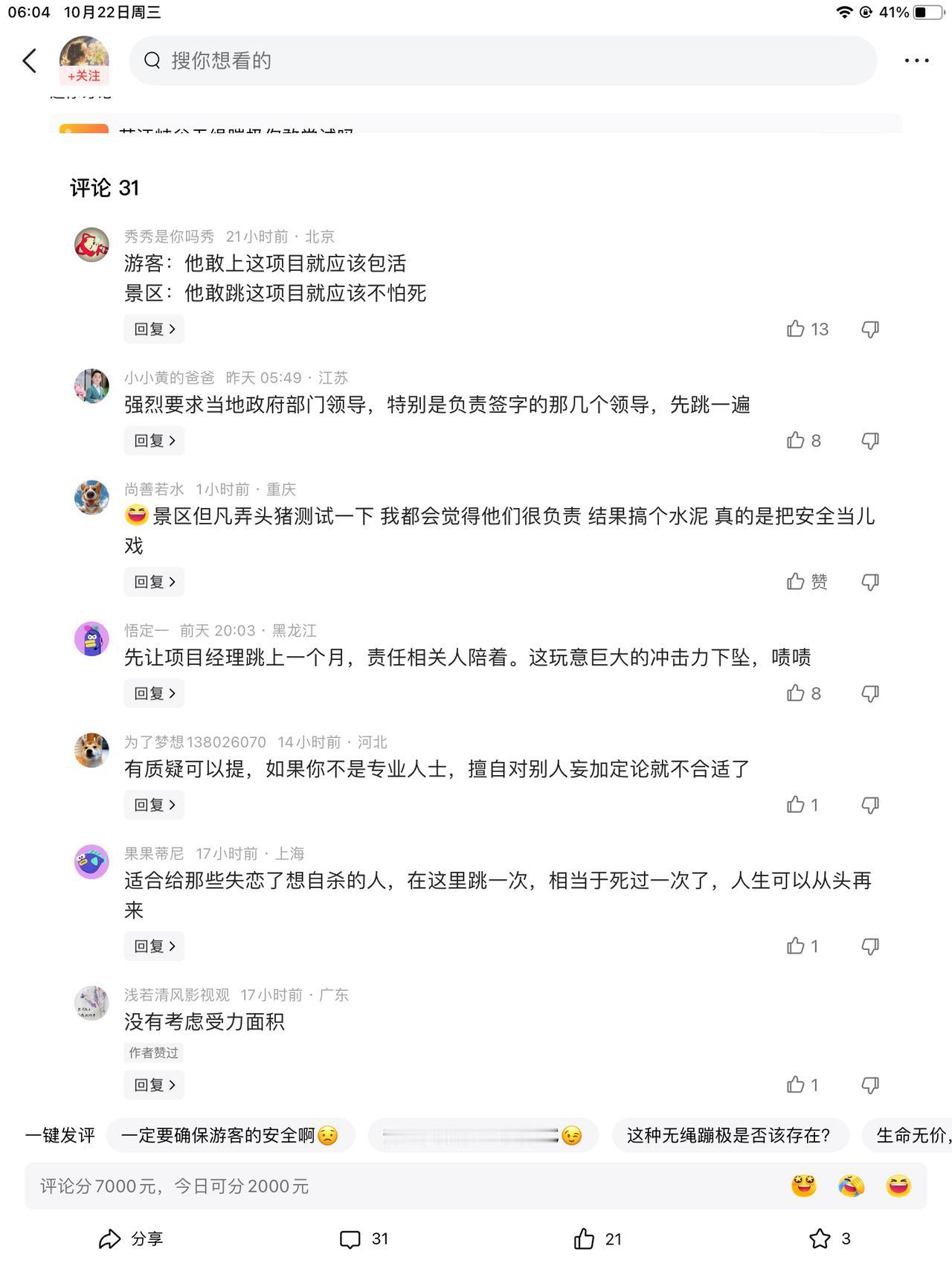 花江峡谷无绳蹦极今日开业! 有胆子大的,对生活厌倦已久的可以去尝试了!前提是仅仅用沙袋做过实验,能落在网兜里。 游客请注意,他敢上这项目,可不保活。景区有最终解释权。! 笑死了,这项目是怎么过审的呢?难道签字的人跳过? 用头猪厕所,起码是个活物,这整的?期待吧,有好事的今天可以去蹲点。看有没人去吃第一只螃蟹?
