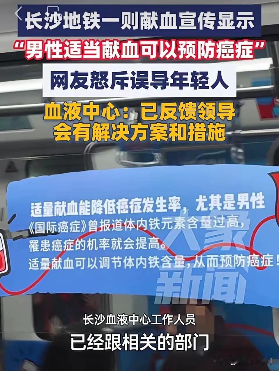 近日,长沙地铁上的一则献血广告引发热议,广告称“适量献血能降低癌症发生率,尤其是男性。适量献血可以调节体内铁含量,从而预防癌症”。这些表述引发网友的质疑:“献血预防癌症是否有严谨论证?”21日上午,记者致电长沙地铁,询问地铁上是否有这则广告,地铁工作人员表示可以记录问题,帮助反馈。随后,记者致电长沙血液中心,该中心工作人员表示,他们在同广告发布部门核实后,确定这条广告是长沙血液中心发布。“我们当时审的时候,把这个部分删掉了,可能是地铁当时没有按我们修改的版本发,或是发错版本了。”工作人员进一步表示,将会安排工作人员将该广告撤下。 有网友表示:现在各种献血谣言可多了,这个叫愚民政策。好在网络发达了,很多人已经不信了。 看看医院的医生们有几个献血的,一年献几次?发个献血证明给大家看看,让大家学习一下! 要想一想!人们为什么壮烈舍弃了主动奉献的信念与爱心!而非五花八门的大字报!文字游戏耍的不错,可是人民的眼睛是雪亮的!你看这大字报说的话满满的悠悠迷魂香味儿,扑面而来!体现出什么样的社会价值观念?道德就是这样一点一点被他们自己毁灭的!真是一本正经的干坏事。 不去找百姓为什不献血的原因,而去造谣欺骗,如今的百姓可不是三十年前了。 对此大家怎么看呢