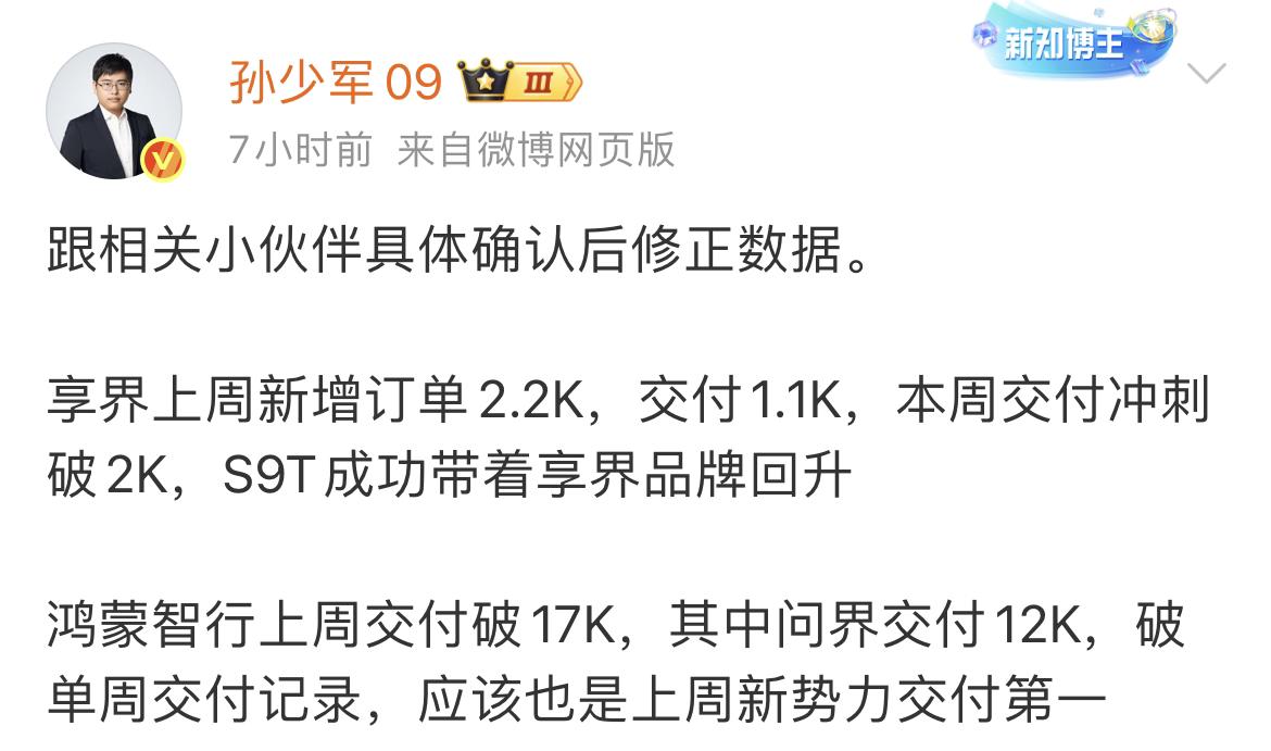 鸿蒙智行上周交付17000+台,问界就贡献了12000台,享界有提升新增订单2200,交付1100; 零跑上周交付13000台,C系列7700+、B系列4500+; 蔚来上周交付10600+台,蔚来4000+、乐道5000+,萤火虫1500+。 鸿蒙智行要冲击新势力第一的节奏,华为的带货能力max!【来自懂车帝车友圈】
