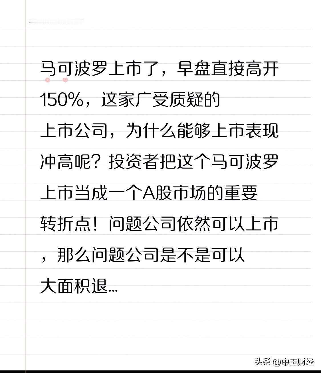 【马可波罗!马可波罗】马可波罗成功上市,早盘直接高开150%。这家饱受质疑的上市公司,为何上市表现能如此冲高呢? 投资者将马可波罗上市视为A股市场的一个关键转折点!既然问题公司能够上市,那么问题公司是否也能大规模退市呢? A股上市呈现出的新股特殊化、差异化交易,在国际资本市场中并不存在。国际资本市场采用的是T+0且无涨跌幅限制的交易模式,所有股票地位平等,交易统一公平。没有涨跌幅限制,当天还能实现做空和做多,股票价格自然是优质股表现良好,劣质股跌破发行价甚至大幅下跌。 A股的这种模式,引发的市场缺陷风险极大,累积的筹码风险更是前所未有的。 有投资者称,马可波罗上市之日便是自己退出A股市场之时;也有投资者觉得,这就是A股市场的现状,只能选择顺应。 大家对此有何看法呢? 用一句话形容现在股市 你知道哪些真话