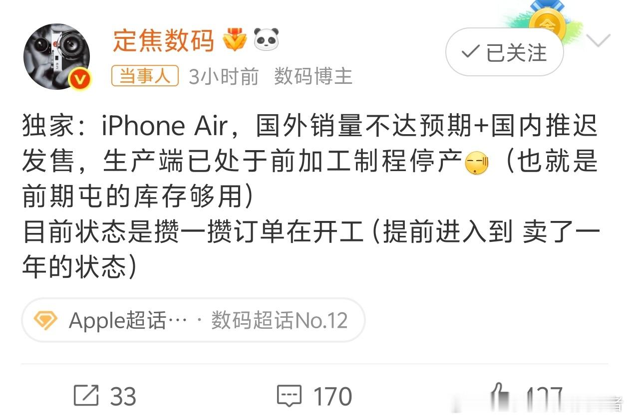 曝iPhoneAir暂停生产网传iPhoneAir已经暂停生产,具体原因是国外