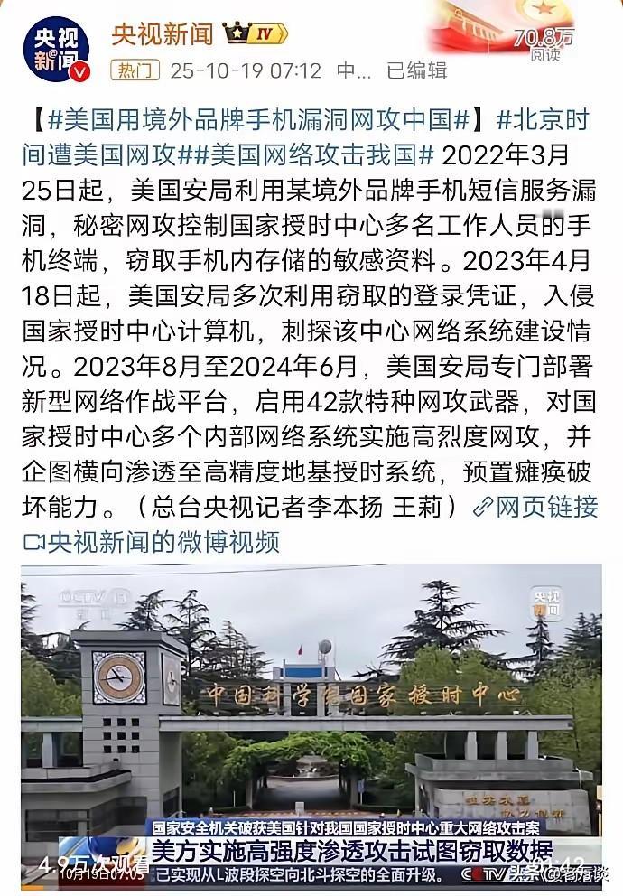 央视新闻曝光了美国,而且还不是黑客,而是美国官方安全局,曾经以威胁美安全为名,多次入侵我国授时中心工作人员的手机,窃取手机里的敏感信息,当看到这个新闻的时候,不清楚美国为什么要入侵授时中心工作人员的手机,那只是一个关于播报时间的机构,能有什么重大秘密吗?直到看到专家对此进行的分析,才发现美国真的是包藏祸心。 授时中心很重要,它不但关系到变电站的精确运行,而且还关系到广大股民的切身利益,因为股市的涨跌可能就在一分一秒之间,这对于我们日常的生活是有很大影响的。美国真的是居心叵测。