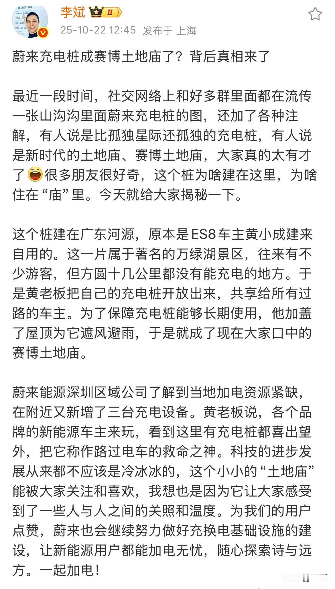 李斌解释: 为啥充电桩变成庙了? 今天下午,李斌在社交网络上发了张有意思的图片,里面有一个充电桩被一个类似于庙的小房子给罩了起来[捂脸] 原来这个充电桩是车主自己弄的,人家是真的爱惜这个东西,花心思给他弄了一个小房子,围起来,这样他就不会经历风吹日晒! 根据李斌的描述来看,这个地方在风景区里面,平时也来不到几个人,所以有人来的话,可以随便充充电,人家主打的就是一个自建共享! 看得出来这段时间他的心情挺好的,这种事情他也拿出来说,主要是不管是ES8还是乐道系列,现在都卖得不错,上个月卖出去了一万多台,所以基本上这段时间他的心情是美美的。 如果能够保持这种状态的话,接下来这几个月,就要实现他前段时间的目标:赚钱! 现在看来,李斌还是有战略高度,和战术执行力的,年初说的话,在年尾马上就要兑现了。