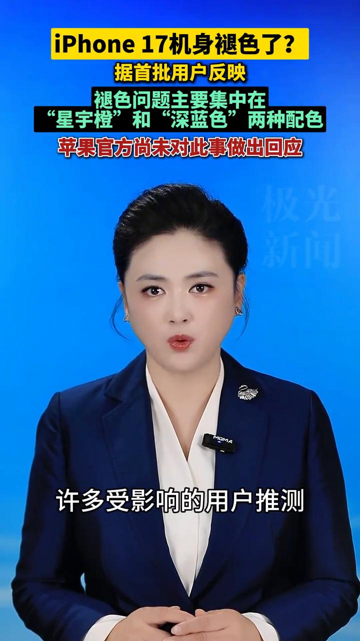 iPhone17机身褪色了? 极光新闻主播陈晓睿。 第一批到手的新iPhone17已经开始褪色了。据首批用户反映,褪色问题主要集中在"星宇橙"和"深蓝色"两种配色上,而且褪色问题似乎存在统一的规律。颜色首先从凸起的相机岛区域开始变淡,然后逐渐扩散至整个铝合金材质的机身边框。值得注意的是,机身背部的中央哑光玻璃面板并未受到影响,与褪色后的金属部分形成了鲜明对比。 关于褪色原因,许多受影响的用户推测与紫外线有关。他们表示,在将手机短暂置于阳光下之后,便观察到了明显的褪色现象。部分用户甚至调侃称,只需将"星宇橙"版iPhone17Pro放在太阳下晒一会儿,就能免费获得一台独特的"玫瑰金"版手机。目前,苹果官方尚未对此事做出回应。
