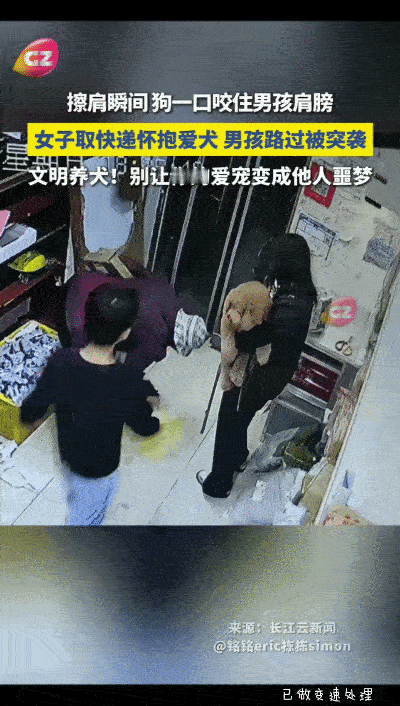 江苏,女子取快递怀抱着狗狗,绳子在手里攥着,男孩路过瞬间,被狗狗咬到,男孩迅速往