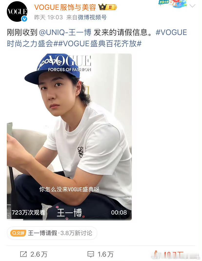 其实我一直以为王一博是VOGUE员工只有王一博请假文案不一样