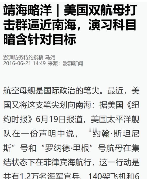 很多人以为,中美开战在即。错了,真相是,最接近战争的时刻,是2016年的南海。当时美国双航母压境,叫嚣“今夜开战”,结果在中国120艘战舰和东风-21D面前,连夜后撤几百海里。那一晚,美国就已彻底失去了动武的胆子! 2016 年夏天,菲律宾单方面提起南海仲裁案,美国则以此为契机在南海部署了军事力量 —— 这也是中美距离冲突最近的一次,后续相关局势与此相比明显缓和。 当时美军集结了 “里根号” 与 “斯坦尼斯号” 双航母战斗群,搭配 10 艘巡洋舰、驱逐舰以及两艘攻击型核潜艇,140 余架舰载机可随时升空,1.2 万名官兵进入战备状态。时任美国太平洋舰队司令公开表示已做好 “今夜开战” 的准备,他们或许认为中国辽宁舰当时战斗力尚未完全形成,希望通过这样的军事威慑促使中国妥协。但他们显然打错了算盘。 中国直接把北海、东海、南海三大舰队的家底都亮了出来,一百二十艘舰艇在南海排开阵势,052D驱逐舰、核潜艇这些精锐全在列。 更狠的是,四位海军上将直接到一线坐镇指挥,这可不是普通演习的规格,明摆着就是“奉陪到底”的信号。 最让人动容的是,三艘正在东海海试的052D驱逐舰接到命令后,立刻停下手头工作,直奔湛江港装填实弹南下,舰上二百七十多名工程师和技术人员全都拒绝下舰,还写好了遗书,这群拿笔杆的人都做好了跟军舰共存亡的准备。 空中力量也没闲着,轰-6K轰炸机挂着实弹在黄岩岛上空巡航,官方直接放出照片,这张照片比任何警告都管用,意思很明确,你们的航母在哪儿我们看得一清二楚,随时能找上门去。 陆地上的火箭军更不是摆设,东风-21D和东风-26反舰弹道导弹早就进入战备状态,这些被称为“航母杀手”的家伙,专门盯着移动中的大型舰船,当时已经锁定了目标区域。 为了让美国人看明白实力,咱们还搞了场实弹演练,导弹精准命中了海上高速移动的靶船,等于直接演示了“怎么打沉航母”。 7月12日仲裁结果公布那天,全世界都屏住了呼吸,媒体突然没了声音,两边的军舰就这么在海上对峙着,稍微有点误判就可能引爆冲突。但美国人心里的小算盘很快就打不下去了,他们的航母位置被咱们的卫星实时监控,一举一动都暴露在眼皮子底下,而东风导弹的射程早就把整个南海罩住了,现代海战里“被发现基本等于被摧毁”,真打起来这两艘航母就是活靶子。 更关键的是,他们没想到中国能拿出这么强的决心,连技术人员都愿意拼命,这种意志力根本不是靠装备能抵消的。最后啥也没发生,美国航母战斗群悄悄后撤了几百海里,退出了南海核心区域,之前喊的“今夜开战”成了笑话。 其实他们心里门儿清,真动手讨不到好,别说两艘航母,就算再来一艘,面对中国的岸基导弹、海空协同力量,也讨不到便宜。 更讽刺的是,菲律宾新总统杜特尔特上台后直接转向中国,中菲关系迅速回暖,美国想借盟友施压的算盘彻底落空,所谓的“仲裁结果”最后成了没人当回事的废纸。 从那以后,美国在南海确实还会派军舰来晃悠,搞搞所谓的“自由航行”,但再也没敢派双航母战斗群搞这种硬碰硬的威慑。 因为他们彻底摸清了底线:中国在核心利益上绝不会让步,而且有实力守住底线。九年前咱们靠一百多艘舰艇和东风导弹逼退了双航母,现在早就不是一个量级了,福建舰带着电磁弹射器已经海试成功,八艘055万吨大驱成了标配,手里的家伙比当年更硬了。 所以说,中美之间最危险的时刻早就过去了,2016年南海那一夜,美国不是失去了动武的胆子,而是彻底认清了现实,跟一个有决心、有实力捍卫主权的中国动武,根本没有胜算。后来那些折腾,不过是不甘心的虚张声势罢了。 这世上的和平从不是求来的,都是靠实力挣来的,2016年南海的波涛早就证明了这一点,有硬碰硬的底气,才有用不着打的安宁。 信息来源如下图: