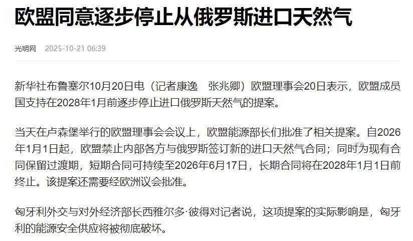 欧盟用最大力气把俄罗斯推到中国一边,欧盟将从2026年1月1日起,禁止成员国和俄罗斯签订新的进口天然气协议。   10月20日,欧盟理事会拍板做出了这项决定,这等于欧洲主动切断了自己的一大气源,而俄罗斯转头就把能源出口的重心,牢牢扎在了东方。   消息刚出来,匈牙利就第一个急了。匈牙利超过80%的天然气都来自俄罗斯,外交部长西雅尔多直接放话,这政策会毁了本国的能源安全,甚至威胁要打官司阻止决议生效。   但欧盟铁了心要跟俄罗斯脱钩,哪怕匈牙利投了反对票,提案还是靠“特定多数”过了关。这种不管成员国实际情况的“一刀切”,让欧洲内部的裂痕越来越明显。   俄罗斯可没功夫纠结欧盟的小动作。就在欧盟宣布禁令的同一天,俄副总理诺瓦克访华时就承诺,到2025年底,通过“西伯利亚力量1号”管道输给中国的天然气,就要达到380亿立方米的设计上限,之后还计划把这条管道扩容到每年440亿立方米。   更关键的是“西伯利亚力量2号”,这条途经蒙古国、每年能输500亿立方米的超级管道已经开工了,预计2029年就能投产。   再加上远东管道的扩容,未来俄罗斯每年卖给中国的天然气总量,能突破1000亿立方米,这相当于现在欧盟从俄罗斯进口量的三分之二。   欧盟本来打着小算盘,觉得禁了俄气后,靠可再生能源和美国的LNG(液化天然气)就能补上缺口,可现实直接给了它一巴掌。   就说德国,虽然可再生能源发电占比已经冲到59.4%,但天然气储备还不到30%,一到冬天供暖,还是得靠进口。美国倒是拍胸脯说每年多给欧盟500亿立方米LNG,可2024年欧盟从俄罗斯买的天然气还有1550亿立方米,美国那点量连零头都不够。   更尴尬的是,欧洲现有的LNG接收站早就满负荷运转了,新建的项目至少要等到2028年才能用,这中间的几年缺口根本没法填。   我们这边则趁机抓紧扩建能源设施,2024年中国的LNG接收站已经增加到31座,一年能接卸1.65亿吨天然气,还建成了中俄原油管道二线,每年从俄罗斯进口的石油超过1亿吨。   更厉害的是,中俄贸易里90%以上都用人民币和卢布结算,彻底绕开了美元,这种深度绑定让俄罗斯就算丢了欧洲市场,能源出口收入也能稳住。   欧盟的禁令还引发了连锁反应。波兰、立陶宛这些东欧国家开始慌了,生怕俄罗斯会通过白俄罗斯、乌克兰这些邻国,切断对欧洲的剩余能源供应,冬天断气可不是闹着玩的。   法国、意大利等南欧国家也怨声载道,因为能源成本飙升,本国的化工、钢铁这些高耗能产业竞争力直线下降,不少工厂都开始减产。   更讽刺的是,欧盟一边喊着禁俄气,一边又得从土耳其、阿塞拜疆等国高价买气,2024年欧洲天然气价格比亚洲还高40%,等于自己给能源账单加了价。   现在这场能源博弈的结果已经很清楚了:欧盟本来想拿捏俄罗斯,却反倒把它推向了中国,自己则掉进了能源危机和经济衰退的泥潭。而中俄的能源合作,不光保障了双方的战略安全,还在国际上重塑了能源格局。   当欧洲还在为冬天的天然气发愁时,中俄已经在西伯利亚的冰原上,铺好了通往未来的能源动脉。这局棋,欧盟输得明明白白,而中国和俄罗斯,早就实现了双赢。
