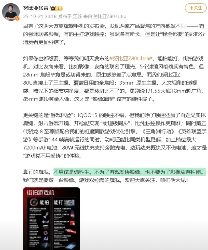 没想到努比亚直接点名了真我GT8和IQOO15偏科,称他们是一个偏向影像,一个偏向游戏。 努比亚Z80Ultra发布在即,官方称为:“不为了游戏妥协影像,也不要为了影像放弃性能” 具体表现怎么样,我们还是明天发布会上看看吧。