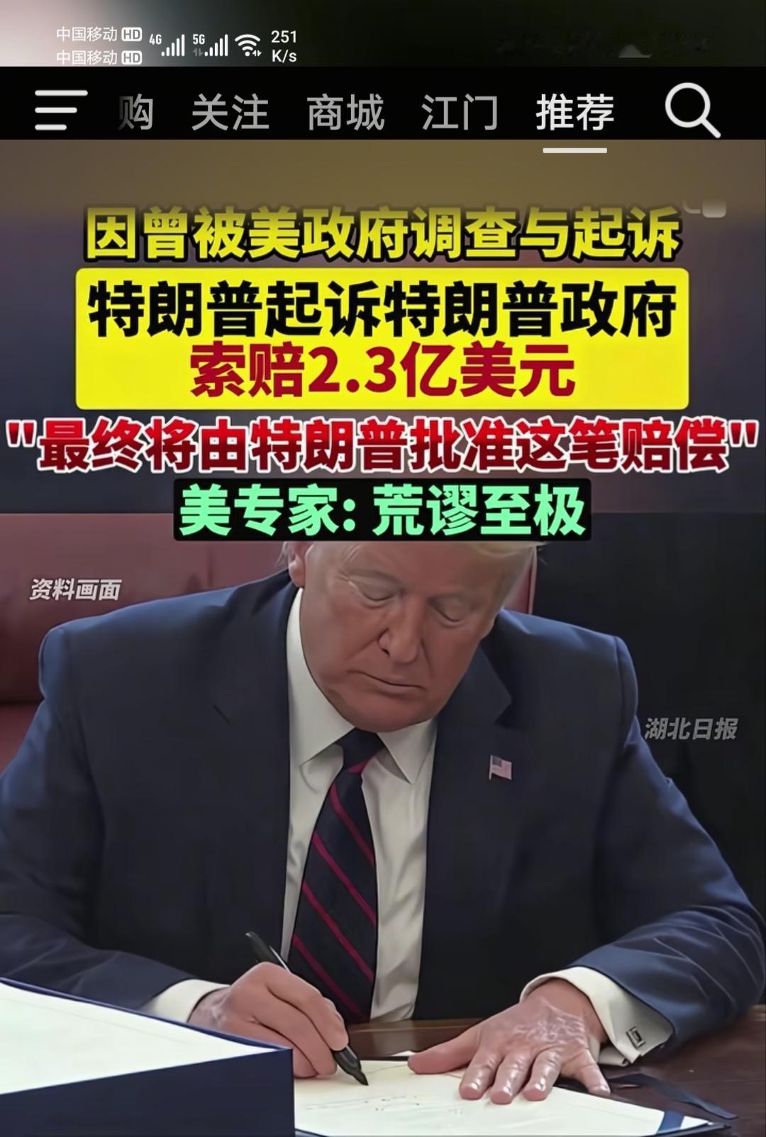 “奇葩”事:特朗普起诉特朗普政府索赔2.3亿美元 据报道,因曾被美国政府调查与起诉,特朗普起诉特朗普政府要求索赔2.3亿美元,最终将由特朗普批准这笔赔偿。 特朗普强调,最终批准这笔赔偿的人将是他本人,在美国政治与司法上尚无先例,这个决定最终得经过我这张办公桌,这种要决定是否给自己赔偿的情况挺奇怪的。而美国专家认为,这真的是荒唐至极! 对此有网友评论称:“搞钱特朗普绝对是认真的,他常常在“搞”总统与搞钱及搞笑之间、亳不犹豫的选择了搞钱和搞笑!”。 可见,美国政治什么奇葩事常有也不足为奇!