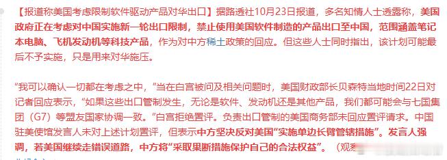 美东时间10月22日,彭博社和路透社等多家媒体报道,特朗普政府正在考虑一项计划,限制从笔记本电脑到喷气发动机等一系列软件对中国的出口,产品范围涵盖全球范围内使用或包含有美国软件的产品,即在全球范围内限制包含美国软件或使用美国软件生产的产品对中国出口,以报复中国最新一轮的稀土出口限制