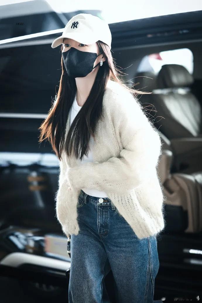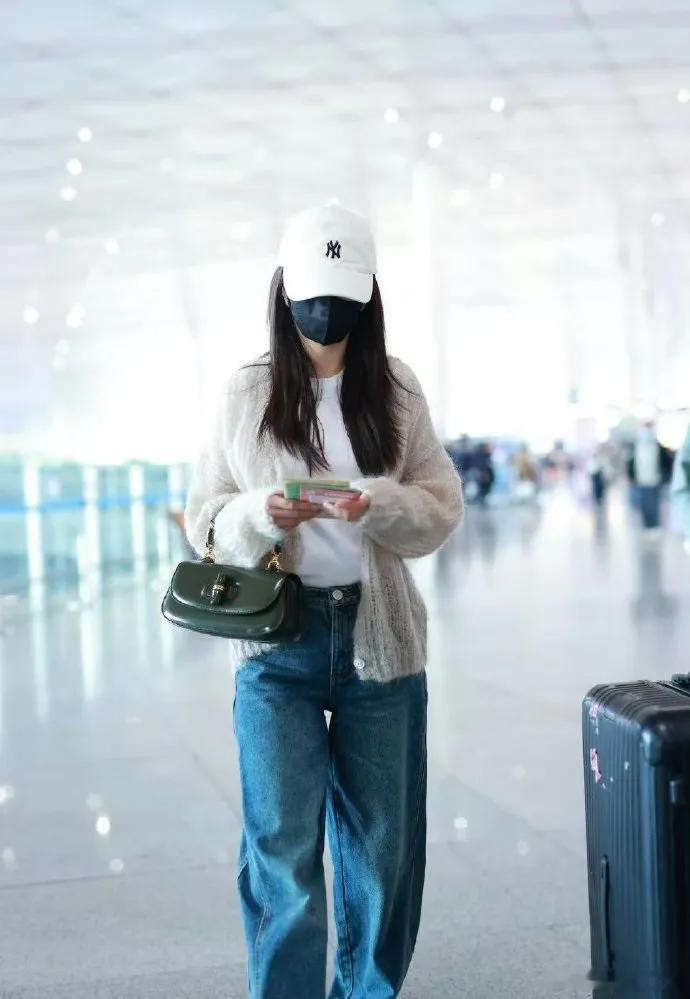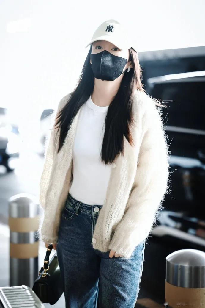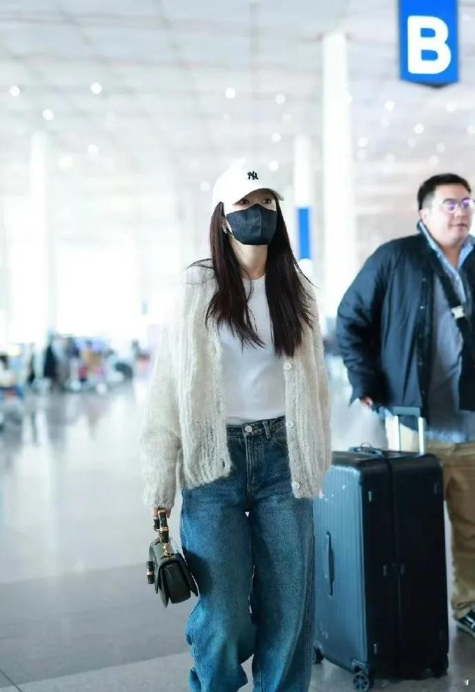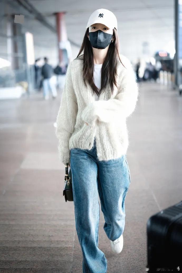 李沁现身北京机场,白T配蓝牛仔裤搭白色针织衫,厚底鞋黑包长发配白帽,清新时尚又温柔靓丽。