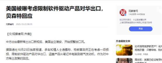 还是熟悉的戏码!赶在会谈前,美国再次对我们进行威胁!10月23日,根据法新社报道,多名知情人士称,美国政府正考虑推出一项新措施,限制一系列使用美国软件制造或含有美国软件的产品出口到中国。而如果这一措施实施,受影响的产品范围可能涵盖从笔记本电脑到飞机引擎等多种高科技设备。 美国方面表示,此举是以回应北京近期扩大稀土出口限制的举措。法媒表示,如果这一措施落实,将标志着美中贸易对峙的又一次重大升级。很显然,此前美国财长贝森特表示,本周将在马来西亚会见中方代表,并为月底可能的中美最高层级的会晤铺路。而美国总统特朗普本人表示,美国希望帮助中国,而非伤害中国。 美国这招其实是老套路了。当年对付俄罗斯,美国就用过这三板斧:高关税、供应链脱钩、技术封锁。 特朗普团队觉得这招好使,就想照搬过来对付中国。他们以为对中国3700亿美元商品加征25%关税,再把华为等中国科技企业列入实体清单,就能让中国乖乖听话。但他们忘了,中国和俄罗斯不一样。中国有全球最完整的工业体系,还有14亿人口的大市场,更有“一带一路”朋友圈的支持,根本不吃这一套。 这次美国又想拿软件出口做文章,要知道现代制造业里,软件几乎渗透到了产品设计、生产和运行的每一个环节。美国要是真限制这些产品出口,影响可不小。 就拿航空发动机来说,西方国家生产的航空发动机在设计阶段几乎都得用美国软件工具。要是美国限制出口,荷兰ASML这样的企业可就麻烦了,他们的光刻机里的精密激光器、磁铁等部件都离不开稀土,而中国在稀土供应链上占着近乎垄断的地位。 美国这么做,其实也是被中国的稀土出口限制给逼的。10月9日,中国商务部一口气发了六条公告,对稀土出口管制加码。境外产品只要中国稀土成分超过0.1%,就得走审批流程,军事用途直接被拒。这招直接卡住了西方高科技产业的脖子。美国虽然和澳大利亚签了稀土协议,但要建立起安全、独立的稀土供应链,没个10到20年根本不行。 美国的这波操作,美国企业可不乐意了。英伟达CEO黄仁勋就公开痛批美国政府的科技封锁政策“完全错误”。英伟达在中国市场的占有率从巅峰时期的95%跌到了0%,损失惨重。微软总裁布拉德·史密斯也说,美国的AI相关出口管制是“战略失误”,限制了美国科技公司在全球市场的发展。 更有意思的是美国政府内部也有不同声音。有知情人士透露,美国政府的这个软件限制计划可能最后不会实施,只是用来对华施压。毕竟,真要实施起来,美国自己也得付出不小的代价。美国企业的收入会受影响,全球供应链也会被扰乱。 从这次事件能看出,中美贸易博弈已经进入了更深层次。美国想通过技术封锁来遏制中国发展,但中国也有自己的反制手段。稀土就是中国手里的一张王牌,而美国的软件限制政策,更像是一场豪赌。这场赌局的结果会怎样呢?让我们拭目以待。 来源:观察者网 【美国被曝考虑限制软件驱动产品对华出口贝森特回应】