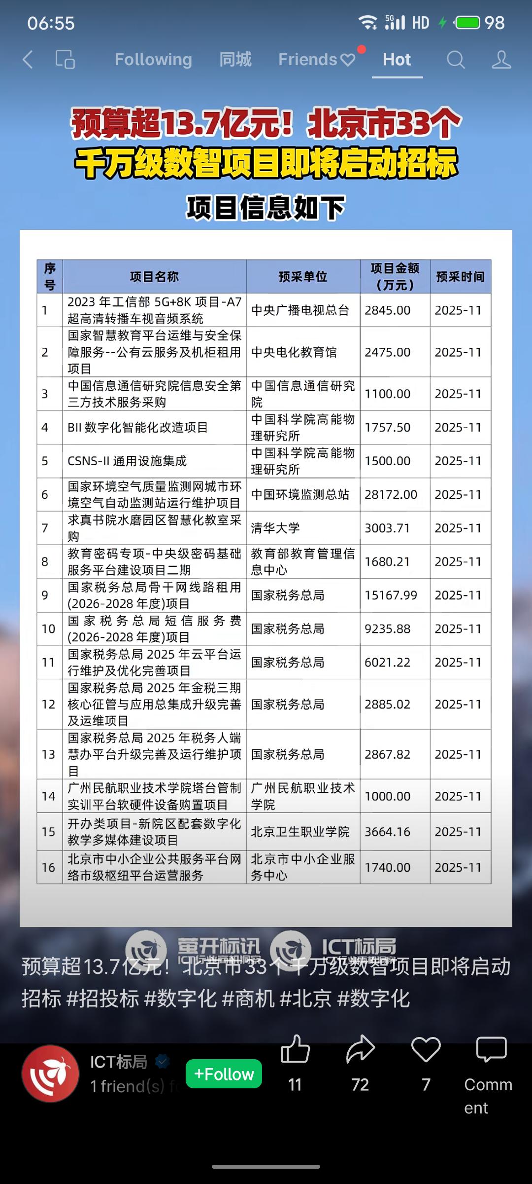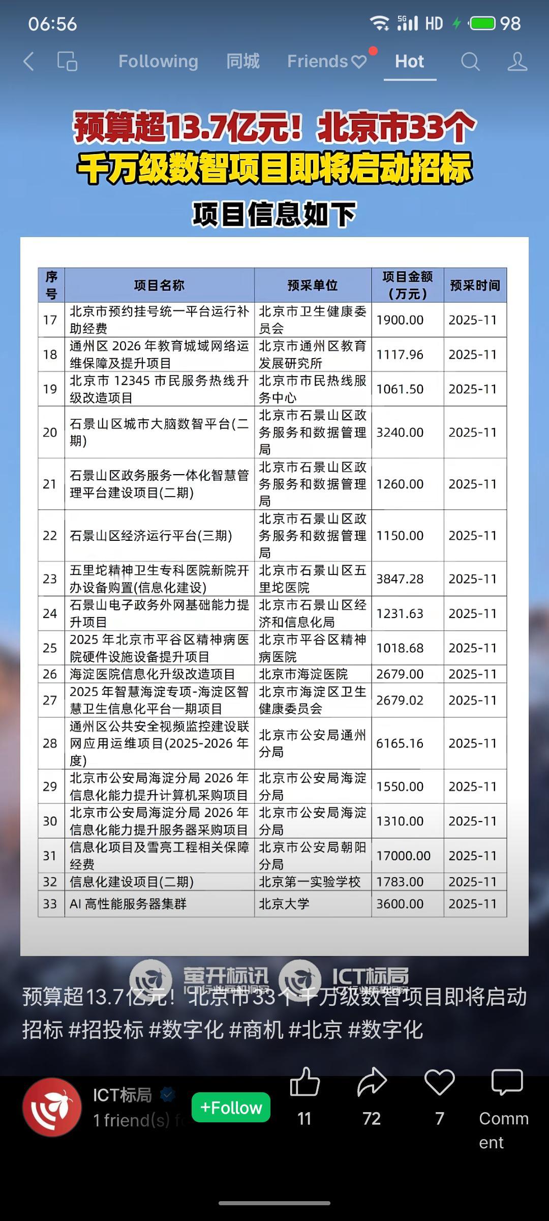 北京市将于2025年11月启动33个数智化项目招标,总预算超13.7亿元。项目覆盖税务、公安、医疗、教育、环保等多个关键领域,其中税务信息化(如国家税务总局多个项目)及公共安全(如公安局视频监控)投入尤为突出。这些项目聚焦于基础设施升级与平台二期建设,显示出政府正系统性地推进城市数字化转型,以提升公共服务与管理效能。