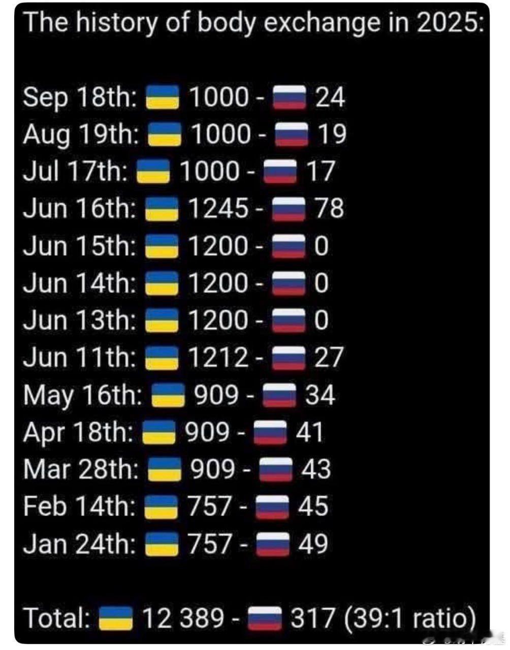 2025年俄罗斯已经还了12389根冰棍,而乌克兰才送回317具遗体