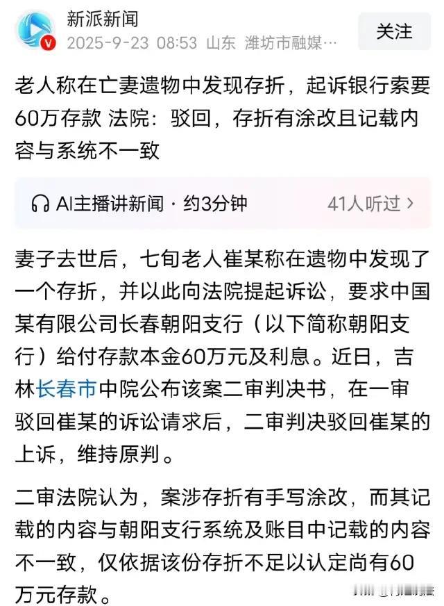 在长春的一条不起眼的小巷里,70多岁的崔大爷经历了一场令人心碎的意外——他的老伴离世了。这个曾经温暖而平凡的家庭,瞬间变得空荡荡的。老人每天的生活仿佛都在等待那一刻的释怀,直到半年后,他决定整理妻子的遗物,试图找回那份逝去的温情。 谁曾想,在一堆旧物中,他意外翻出了一本泛黄的存折——那是妻子用他的身份证办的,存有整整60万的存款。这一发现,犹如晴天霹雳,让崔大爷的心瞬间震颤。那笔钱代表着妻子多年来的辛勤与爱,也象征着他们曾经的梦想和未来的希望。 然而,现实却狠狠地打了老人一个耳光。当他满怀期待地走进银行,想要取出那笔属于妻子的存款时,却被告知“存折是假的”。银行工作人员的冷漠和机械让老人瞬间崩溃:“这怎么可能?这是我老婆用我身份证办的,难道还会有假?”老人满眼困惑、绝望,试图用自己有限的知识和情感去质问,却被告知“无法证明存折的真实性”。 更令人愤怒的是,崔大爷随后起诉银行,试图讨回那份属于妻子的血汗钱。然而,法院的判决却让他心碎——驳回了他的诉求,理由竟然是“缺乏证据证明存折的真实性”。那一刻,老人仿佛被无情的铁幕遮蔽,曾经的信任变成了深深的失望。 这件事情,折射出多少社会的阴暗面?老人面对的,不仅是金钱的迷雾,更是制度的冷漠和信任的崩塌。我们是否应该反思:在这个数字化、信息化的时代,个人的财产安全究竟在哪里?为何一个普通老人,面对银行的“黑箱操作”,却无力反抗?为什么我们总是习惯用冷漠的法律去对待那些最需要温暖的人? 更深层次的意义在于,或许我们每个人都曾在某个瞬间,信任过某个制度、某个机构,然而当信任被辜负时,那份伤痛又该由谁来承担?老人崔大爷的故事,或许只是千千万万个普通家庭中的一个缩影,但它让我们不得不深思:在这个社会的角落,我们是否还能找到那份最基本的温暖和信任? 读到这里,你是否也在心中泛起一股愤怒?或许,我们都曾相信过制度的公正,信任过身边的人,但现实告诉我们,信任的种子需要用制度的阳光去呵护。否则,再美好的故事,也会在一夜之间变成无声的控诉。我们期待的不仅仅是一个公正的判决,更是对那些像崔大爷一样普通人的尊重和守护。因为,只有当每个人都能被真心对待,这个社会才会更温暖、更有希望。社会百态 人间烟火
