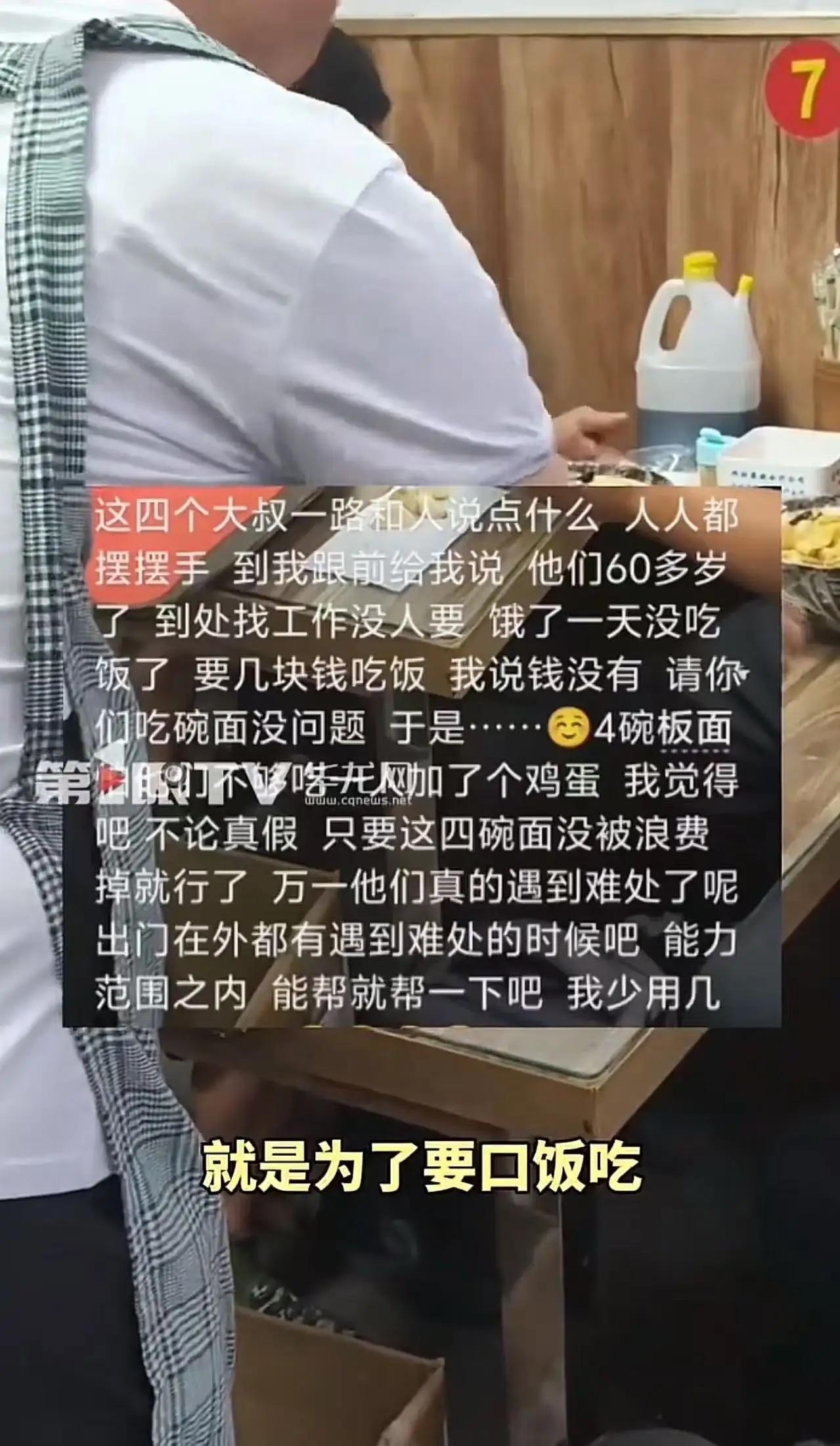 太心酸了!河北,女子在路上遇到四个大叔,他们对女子说自己60多岁了,出来打工一直找不到工作,身上的钱都花光了,能不能给他们点钱吃点东西?可是女子却摇摇头拒绝了!大叔们满脸失望,不料,女子又说:“钱没有,但可以请你们一人吃碗面!” 这句话像是一股温暖的春风,瞬间融化了在场所有人的心。面对那些满脸沧桑、满身疲惫的大叔们,女子没有选择冷漠,也没有用一句“我没钱”推脱,而是用行动传递了最朴实的善意。这一碗面,或许只是一顿简单的饭菜,但它所代表的,却是人性中最纯粹、最动人的善良。 在这个物欲横流、快节奏的社会,许多人习惯了用金钱衡量一切,忽略了那份发自内心的温暖。而这位女子,用一句“请你们吃面”,提醒我们:善意不一定要多么宏伟的行动,它可以是一碗面、一句问候,甚至是一个微笑。正是这些细微的善举,才能在这个浮躁的时代,点亮一盏希望的灯火。 你是否也曾在生活中遇到过类似的场景?也许你没有大笔的钱财,但一句关心的话、一份真诚的帮助,就能让别人感受到温暖。我们常常抱怨社会的不公,抱怨生活的艰难,但其实,善意就在我们身边,只要愿意伸出手,就能改变别人的一生,也许还能让自己变得更好。 这件事告诉我们,善良其实很简单。它不需要华丽的辞藻,也不需要高昂的代价,只要一颗真诚的心,就能成为别人的阳光。更重要的是,善良会像种子一样,在无声中发芽、成长,最终开出温暖的花朵。 你是不是也在反思:我们是否还能保持一颗善良的心?在这个充满功利和冷漠的社会,是否还能坚持那份纯粹的善意?也许我们都可以从身边的小事做起,把那份善意传递出去。下一次,当你遇到需要帮助的人时,不妨想想那碗面,也许它会成为他们生命中最温暖的记忆。 让我们都成为那个传递温暖的人,用行动告诉这个世界:善良,永远不会过时。因为,真正的幸福,来自于给予;真正的温暖,源自于善意。相信,只要我们都愿意伸出援手,这个世界会变得更加美好。人性善良 社会百态