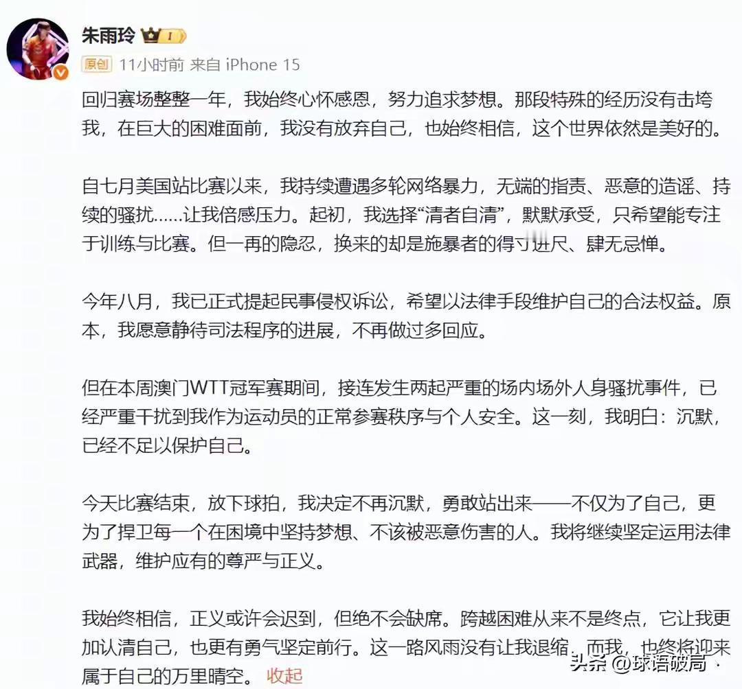 突发!朱雨玲半夜发声,晒报警记录和律师函,正式走法律途径维权 近期澳门冠军赛激烈开展,不过赛场之外并不安宁,众人聚焦国乒表现之时,半夜一则消息冲上热搜,颇为出人意料。 这不是普通的比赛失误,也不是一些运动员的场外琐事,而是一场关系到运动员尊严与权益的重大事件。朱雨玲用行动告诉我们:在光鲜亮丽的运动舞台背后,隐藏着许多不为人知的暗流。 事情的起因很快浮出水面。有人在网络上散布关于朱雨玲的恶意谣言,甚至有人试图抹黑她的职业形象,制造不实信息,企图动摇她的心理防线。面对网络暴力的无情攻击,朱雨玲没有选择沉默,而是用法律武器坚决反击。她在深夜时分晒出了报警记录和律师函,宣告自己不会被谣言左右,更不会让恶意中伤得逞。 这场“战斗”不仅仅是个人的维权,更像是一面镜子,映照出当今社会某些阴暗的角落。网络的自由与匿名,是否也变成了某些人肆意攻击的保护伞?当公众人物成为攻击的目标,社会的良知又在哪里?朱雨玲的勇敢,不禁让人深思:我们是否也应该为每一个被伤害的人站出来发声? 更令人动容的是,朱雨玲在公开声明中提到:“今天比赛结束,放下球拍,我决定不再沉默,勇敢站出来-不仅为了自己,更为了捍卫每一个在困境中坚持梦想、不该被恶意伤害的人。我将继续坚定运用法律武器,维护应有的尊严与正义。 我始终相信,正义或许会迟到,但绝不会缺席”!这句话虽然简短,却充满力量。她用行动告诉所有人:面对不公,我们可以选择沉默,但更应该勇敢发声,用法律和理智捍卫自己。 这件事的背后,折射出的是社会对个人权益的尊重与保护的缺失。我们习惯了在屏幕前看热闹,却很少关注那些为了维护自己权益而奋战的普通人。朱雨玲的勇气,点燃了许多人的希望,也提醒我们:每个人都应该成为自己权益的守护者。 或许,这不仅仅是一次运动员的维权,更是一场关于社会正义的呼声。我们期待,未来的社会能有更多像朱雨玲一样的勇士,用法律和理性守护每一个人的尊严。毕竟,正能量从不缺席,只要有人愿意站出来,用行动点亮希望的火苗。 这场风波还在继续,但无论结果如何,朱雨玲的坚韧已经赢得了人们的尊敬。希望她的行动能激励更多人勇敢面对不公,用法律的力量为自己发声。因为,只有当每个人都敢于站出来,社会的正义才会更加坚不可摧。朱雨玲