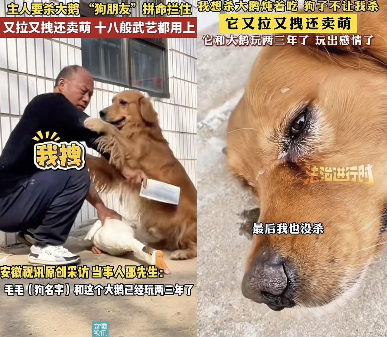 万物皆有灵性!河南,主人想把自家大鹅杀掉炖着吃,万万没想到的是大鹅同意了但 自家的狗子却不愿意了。当主人拿着刀准备杀大鹅时,狗子拼命的阻拦,还给主人撒娇卖萌,又拉又拽还亲亲主人,感觉十八般武艺都用上了,只为求得不杀大鹅之恩。网友:这狗子能处!原来狗狗和大鹅一起生活两三年,感情别提多好了。 当主人拿起刀靠近大鹅,狗子一下子就冲了上来,那劲头,仿佛在说“不许伤害我的小伙伴”。又拉又拽一直不放开主人的手,还把大鹅护在自己身体下,然后和大鹅相拥在一起,流下了伤心的眼泪。主人见状很意外,也很惊讶,这是一段跨越种族的爱情呀! 最后狗狗胜利了,主人不想让狗狗过度伤心,决定不杀大鹅了你瞧,这狗子多仗义啊!我就觉得,万物真的都有灵性,动物之间的感情纯粹又真挚。