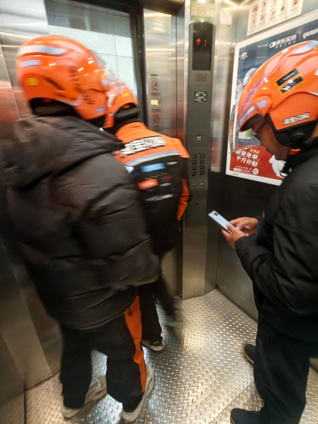 惊呆了,一进电梯,看见三个橙色制服(之前完全没见到过)。全是淘宝闪购。