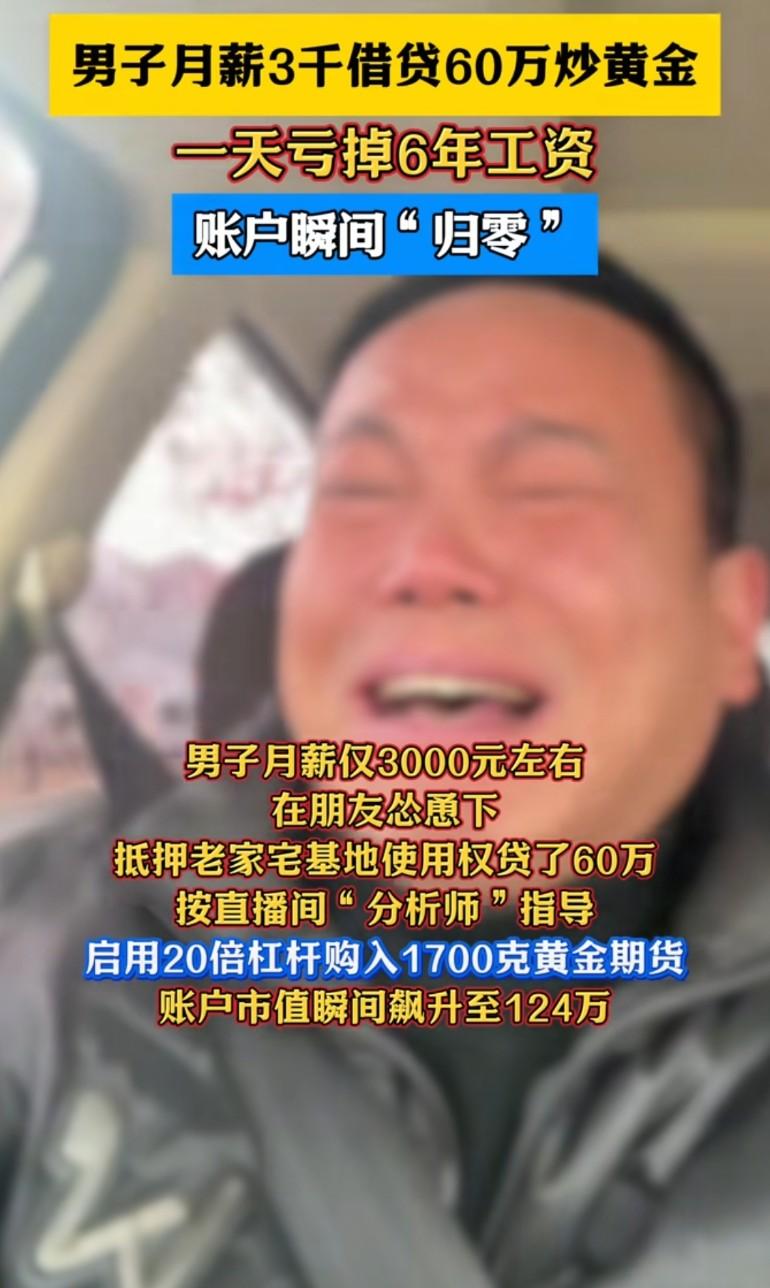 男子月薪3000在朋友怂恿下贷款60万炒黄金,一天亏掉6年工资,账户瞬间归零 始终很清醒的知道一个事,当连小卡拉米都知道一样东西很赚钱时,必然要坏菜或爆雷。一个月3000工资居然敢贷款60万炒黄金,放到现在估计也已经赚了。 月薪 3000 的人敢贷款 60 万炒黄金?这事听着就离谱,可真有人这么干了。河南郑州的一名男子,在朋友天天说 “炒黄金能翻倍” 的怂恿下,偷偷借了 60 万网贷冲进黄金市场,结果短短一天时间,账户里的钱就全没了,相当于白干 6 年的工资打了水漂。不少人纳闷,黄金再跌也不会一天跌成零啊,难道是加了杠杆?还真让说对了,问题就出在这看不见的 “杠杆” 上。 先说说这男子的操作有多冒险。他每个月工资刚够覆盖房租和日常开销,手里几乎没存款,却被朋友发来的 “一周赚 5 万” 的截图勾住了心。朋友告诉他,“现在黄金行情好,用贷款的钱进场,翻几倍后马上抽身,连本带利还了贷款还能剩一大笔”。 被这话冲昏头的他,瞒着家人在三家网贷平台借了 60 万,年利率最高的达到 18%,光每个月利息就要还 9000 多,是他三个月的工资。 他不知道的是,自己炒的根本不是 “实物黄金”,而是带杠杆的黄金期货。这种交易模式,相当于用一笔保证金撬动好几倍甚至几十倍的资金。他开户的平台给了 50 倍杠杆,也就是说,60 万本金能撬动 3000 万的黄金交易。听起来能赚更多,可风险也跟着放大 50 倍 —— 只要黄金价格波动 2%,他的本金就会亏光。 悲剧发生在他进场的第二天。当天国际金价受美联储加息消息影响,开盘就跌了 3%,他买的多单(看涨)瞬间出现巨额亏损。平台系统开始给他发 “追加保证金” 的通知,说如果不补钱,就要强制平仓。 他手里根本没多余的钱,只能眼睁睁看着系统在当天下午执行强平,60 万本金一下子全没了,账户余额变成 0。后来他才知道,朋友所谓的 “赚钱”,也是靠运气踩中短期行情,而且早就把本金抽走了,只剩他自己掉进坑里。 有人会问,就算亏了,黄金本身还在啊,等涨价了再卖不行吗?其实他炒的黄金期货,和我们买的金条、金饰完全不一样。实物黄金买了能拿在手里,就算价格跌了,东西还在,等行情好再卖多少能回点本。 但黄金期货是 “合约交易”,赚的是价格波动的差价,而且有到期日,到期必须平仓,根本没法像存金条一样 “捂着不卖”。更别说他加了 50 倍杠杆,一旦亏损达到保证金比例,平台不会等他 “等涨价”,直接就强制卖掉合约止损,连反应的时间都没有。 这种 “小卡拉米都知道赚钱” 的行情,本身就藏着大坑。去年年底,不少人跟风炒虚拟货币、元宇宙概念,结果没多久就爆雷;前几年 P2P 火的时候,连小区阿姨都在讨论 “年化 20% 的理财”,最后跑路的平台一抓一大把。就像这位男子遇到的情况,当连月薪 3000 的人都被怂恿着贷款进场,说明市场已经热到离谱,风险早就超过了收益。 更让人揪心的是他后续的处境。60 万网贷每个月要还的利息,比他工资还高两倍,现在账户归零,他根本无力偿还。催收电话天天打,不仅影响了他的工作,还让家人知道了这事,原本和睦的家庭闹得鸡飞狗跳。他后悔说,当时就想着 “赚一笔就走”,根本没算过杠杆的风险,也没问过朋友 “万一亏了怎么办”,现在才明白,天上掉的不是馅饼,是陷阱。 月薪 3000 不可怕,可怕的是被 “快速暴富” 冲昏头脑,用借来的钱去赌不确定的行情。这位男子的经历,希望能给更多人提个醒:凡是说 “稳赚不赔”“能翻倍” 的投资,都要多留个心眼,毕竟世上没有免费的午餐,更没有只赚不亏的买卖。 对此,你们有什么看法,欢迎评论留言~