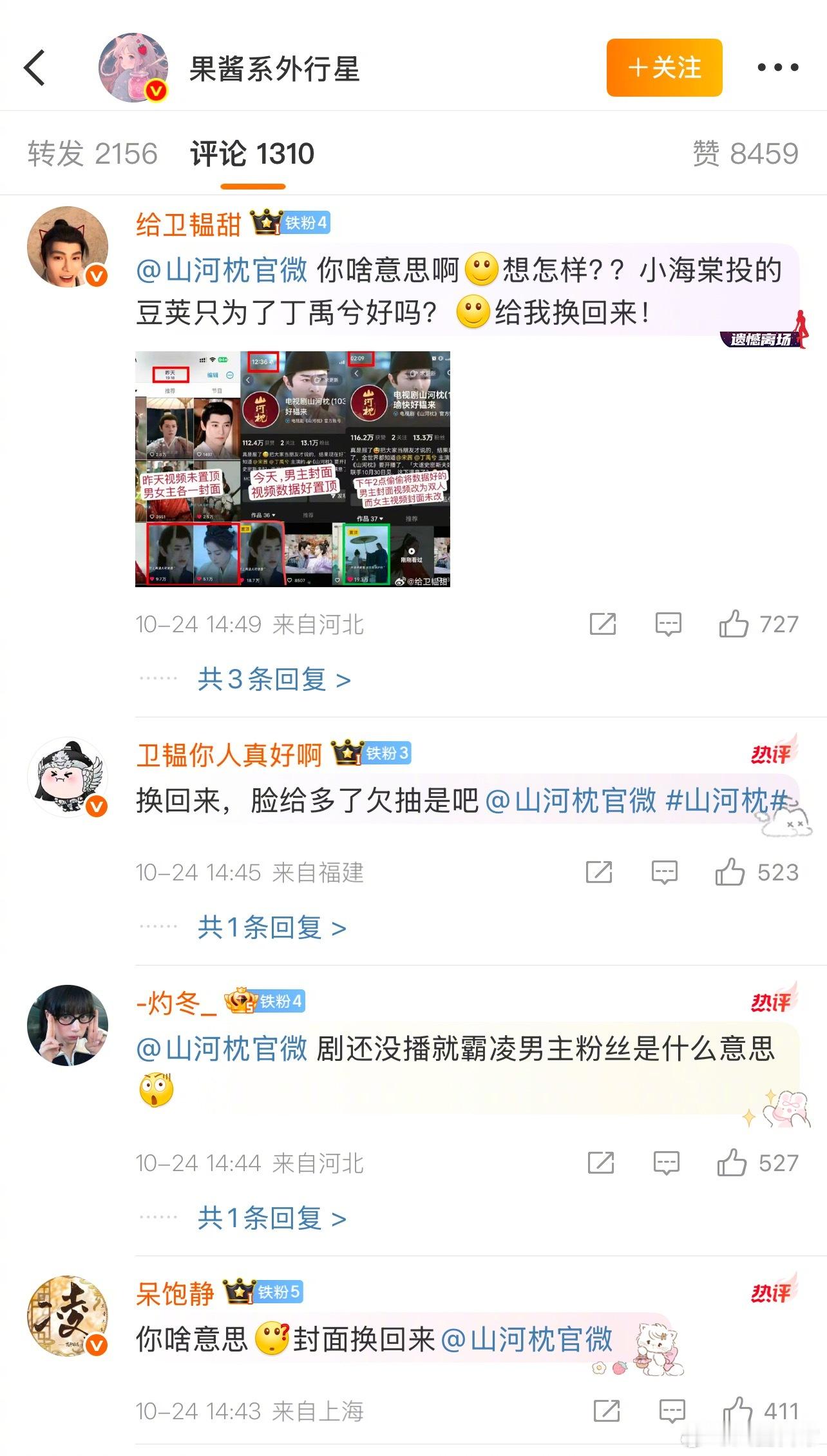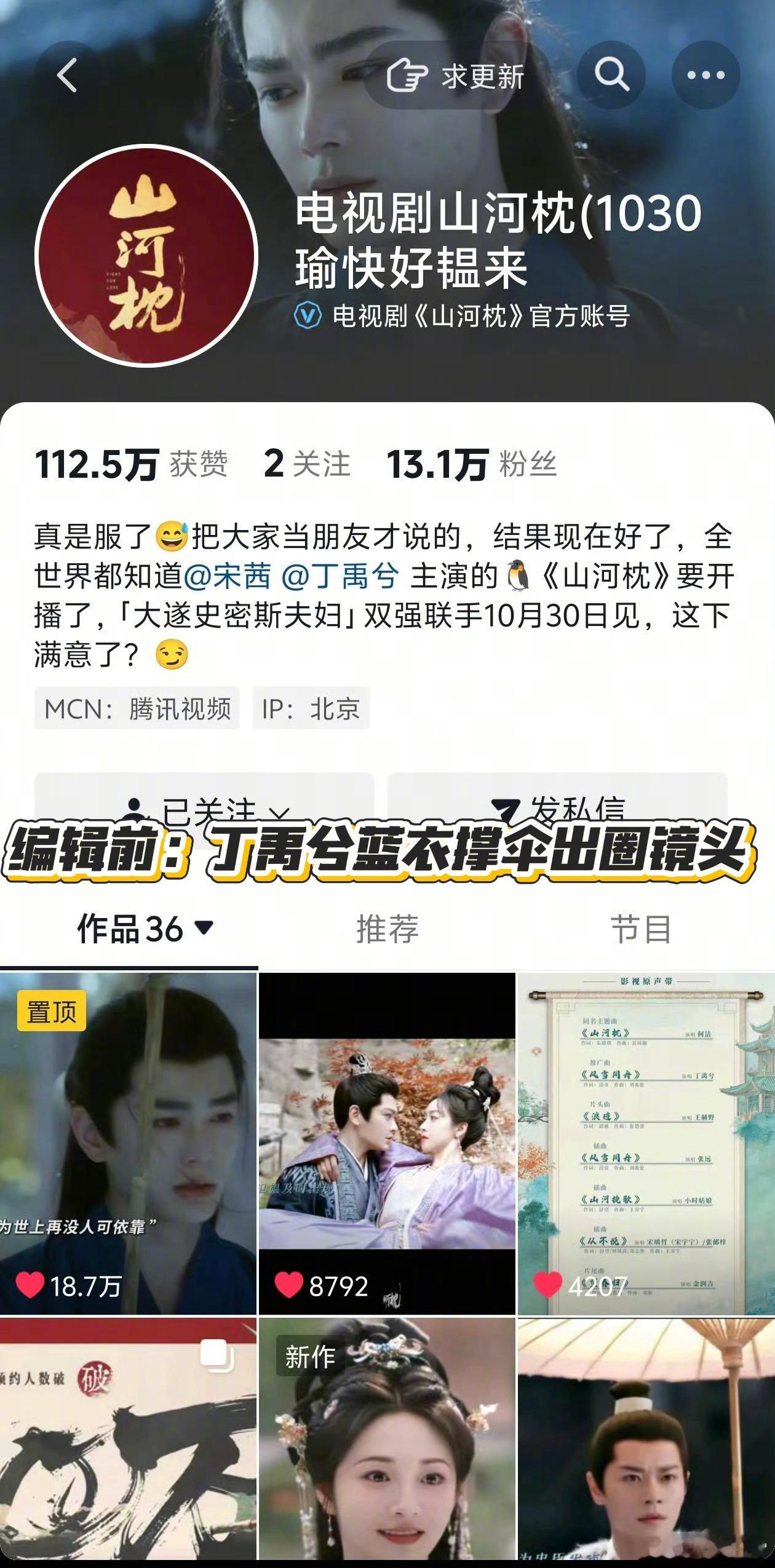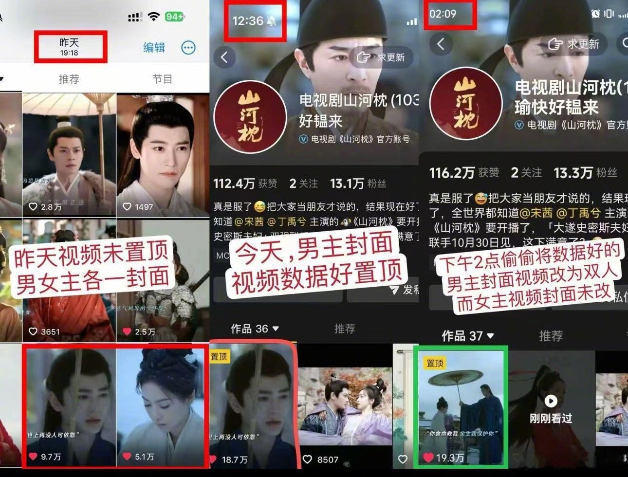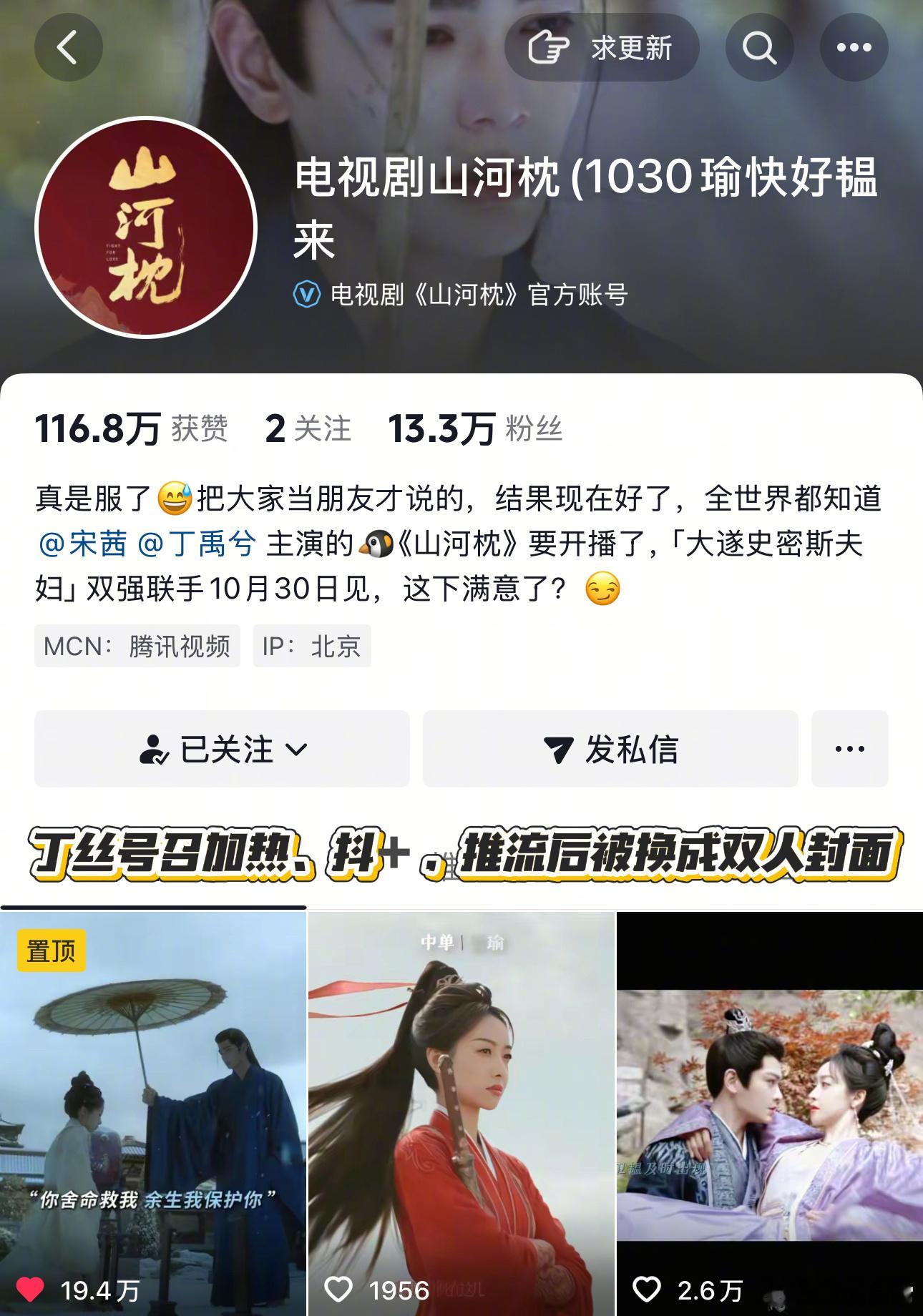 丁禹兮粉丝向《山河枕》剧方维权,因为《山河枕》官抖把丁禹兮单人封面高赞视频突然换成了宋茜和丁禹兮的双人封面
