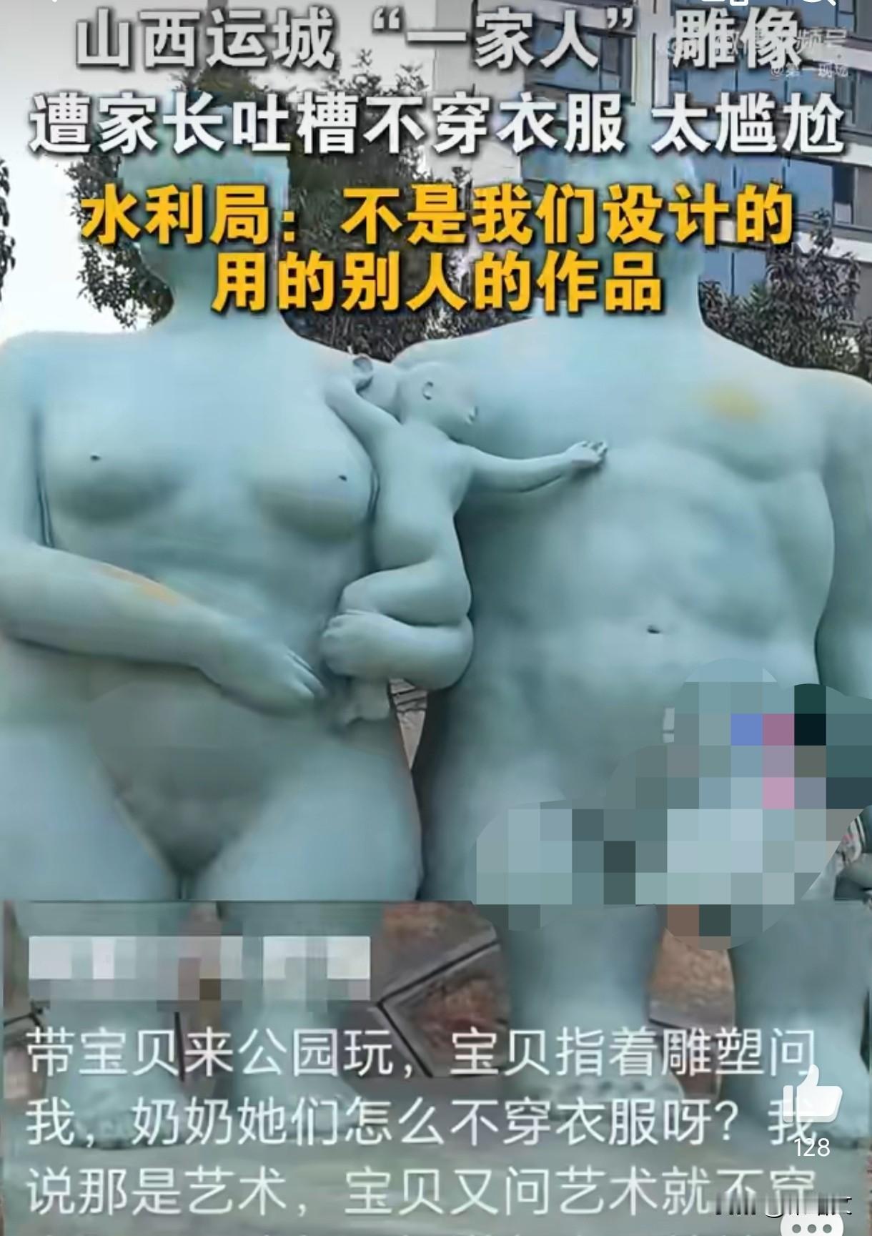 公园裸体全家福戳痛谁?孩子一句追问,戳破艺术遮羞布 你敢信不?公园遛弯遇着裸体“幸福一家人”雕塑,孩子一句“他们咋不穿衣服”,直接给家长问懵圈了,这场景就发生在山西运城的公园里。 这雕塑可不是小摆件,一家四口全裸出镜,底座还刻着“幸福一家人”,说是寓意心灵相通。可家长哪敢跟孩子讲这些,只能支支吾吾说“这是艺术”。 更有意思的是官方回应,水利局说雕塑是厂家用的现成设计,摆好几年了,之前没人提意见。合着摆得久就合理?没人说就是没问题?这逻辑也太牵强了。 负责制作的公司更硬气,直言“思想太保守”,还说设计是清华美院的手笔。清华美院的设计就不用考虑公共场合?就不用顾及老人孩子的感受?这话说得真让人不舒服。 其实这事儿不是头一回发生。深圳锦绣中华的裸体雕塑,被游客吐槽后景区赶紧整改;江苏宿迁风情园的类似雕塑,也被说不顾及妇女儿童。 还有云南丽江那个公园,“人体蜈蚣”雕塑被骂诡异,园方一开始说“理解不同”,最后不还是拆了有争议的作品。艺术不能拿“看不懂”当挡箭牌吧? 问题根本不在艺术本身,维纳斯是经典,但那是放美术馆里的。公共公园跟美术馆能一样吗?前者是老少咸宜的休闲地,后者是专门的艺术场所。 关键得搞懂“公共艺术”的规矩:先有公共性再有艺术性。不能拿着艺术家的名头,强迫所有人接受,这不是艺术,是霸道。 真要摆这类雕塑,至少得做到三点:一是选对地方,别放儿童多的区域;二是加解说牌,讲清设计理念;三是事前征求公众意见,别自己拍板。 运城这地方其实挺懂雕塑的,之前冬奥会不少雕塑都是这儿造的,技术没的说,咋到公共艺术上就犯糊涂了?明显是没找准定位。 艺术从来不是脱离现实的空中楼阁,尤其是公共空间的艺术,得让人看得懂、能接受。不然再有名的设计,引发争议也白搭。 现在这雕塑还立在那儿,到底是该拆了还是加个遮挡?要是你带孩子遇上这情况,会咋跟孩子解释?评论区说说你的招儿。