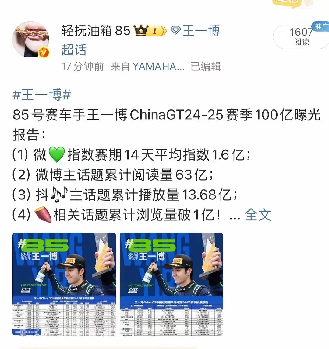 CHINA GT和TOP Speed在海外社交平台宣传和喊话:王一博,期待2026赛季开幕战见到你!(大白话:财神爷,明年你可一定一定要来啊!) 王一博24-25赛季赛事期间热度报告显示,王一博的“王亿博”名副其实[赞]。 王一博真正做到了一人之力带动一个圈层,他在哪里热度就在哪里,官方认证,实力说话。