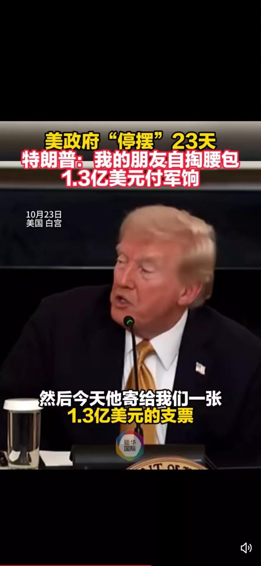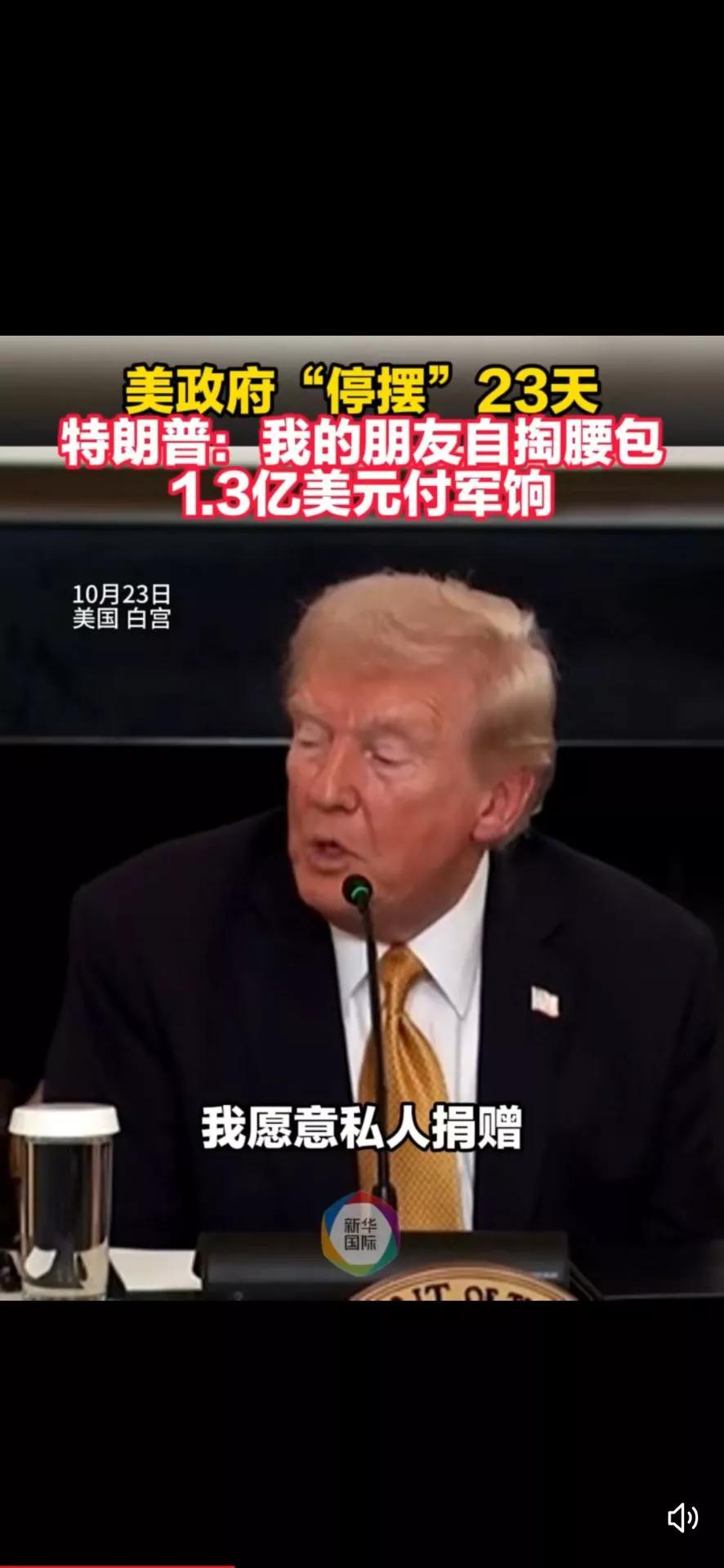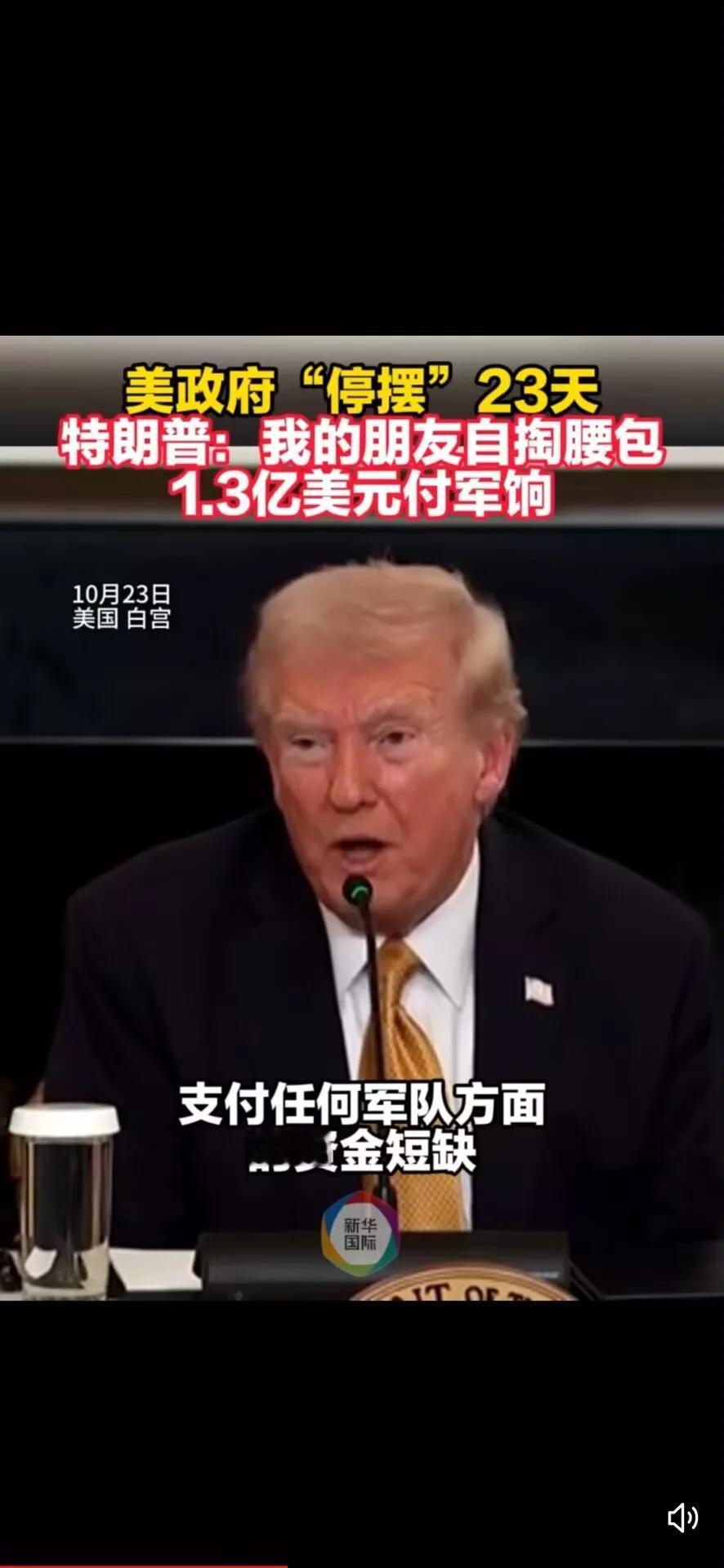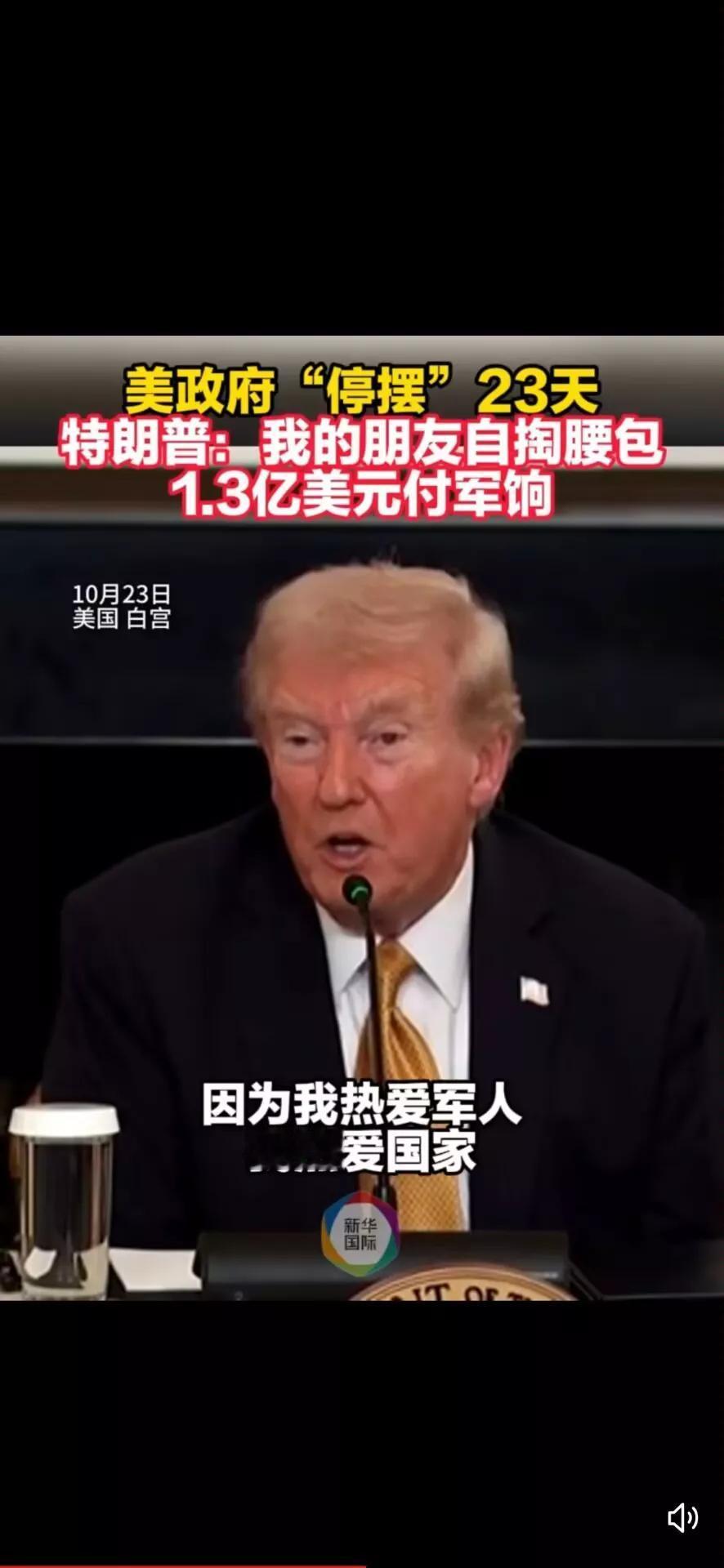哥们儿自掏1.3亿给美军发工资?美国政府停摆23天,特朗普突然爆料!一位神秘老友主动砸钱补军饷缺口,还放话纯粹是爱国。可这波操作,反而掀了美国党争的底裤!这边总统高调炫朋友圈壕气,那边80万联邦雇员还在排队领救济餐,连空管员都得无薪上班。 表面是钞能力救场,实则是政治崩坏的打脸现场。两党为医保福利吵到现在,连军饷都要靠私人捐款续命,五角大楼甚至被迫挪用研发经费。这哪是爱国?分明是给美式民主贴破产标签! 更讽刺的是,特朗普一边骂民主党绑架国家,一边被扒出砍掉民主党州280亿项目资金,被指政治报复。这场停摆早已超出斗气,成了拿民生当筹码的恶性循环。白宫计时器滴答响,两党锅甩得比球快!若制度只能靠朋友圈续命,所谓的超级大国,还剩下多少底气?