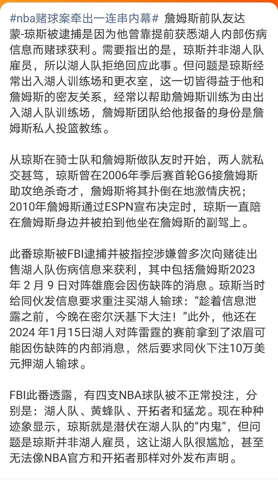 莫非詹姆斯和经纪人都有问题?小杨经纪人富保罗是怎么把一个二轮秀操作到第16顺位的…… 比卢普斯被控多重欺诈罪,每项最高可判20年!更骇人听闻的是,他竟向同谋泄露球队摆烂计划,在官方宣布前透露核心球员轮休! 詹姆斯前队友达蒙-琼斯被逮捕是因为他曾靠提前获悉湖人内部伤病信息而赌球获利。经常以帮助詹姆斯训练为由出入湖人队训练场,詹姆斯团队给他报备的身份是詹姆斯私人投篮教练。 詹姆斯从骑士队开始就经常带很多密友出入球队,甚至要求骑士队为他的朋友安排球队职位,他的朋友和小儿子曾因违规坐在骑士队替补席而被NBA警告过。