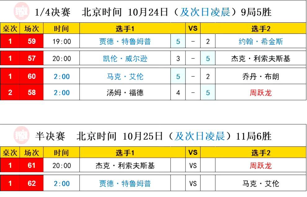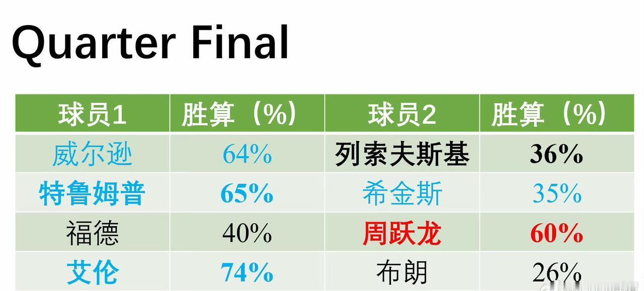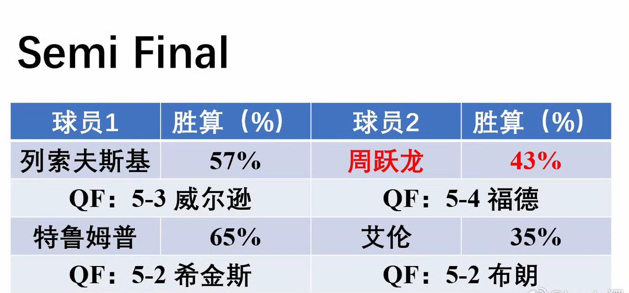 2025斯诺克北爱尔兰公开赛四强出炉: 特鲁姆普:职业生涯第70个四强。 马克艾伦:职业生涯第44个四强。 利索夫斯基:时隔两年再进四强。 周跃龙:本赛季第二个四强。 昨天的胜算表只错了一个,今天的胜算表依然是:小司机、特鲁姆普晋级优势明显。 周跃龙状态火热肯定能晋级。