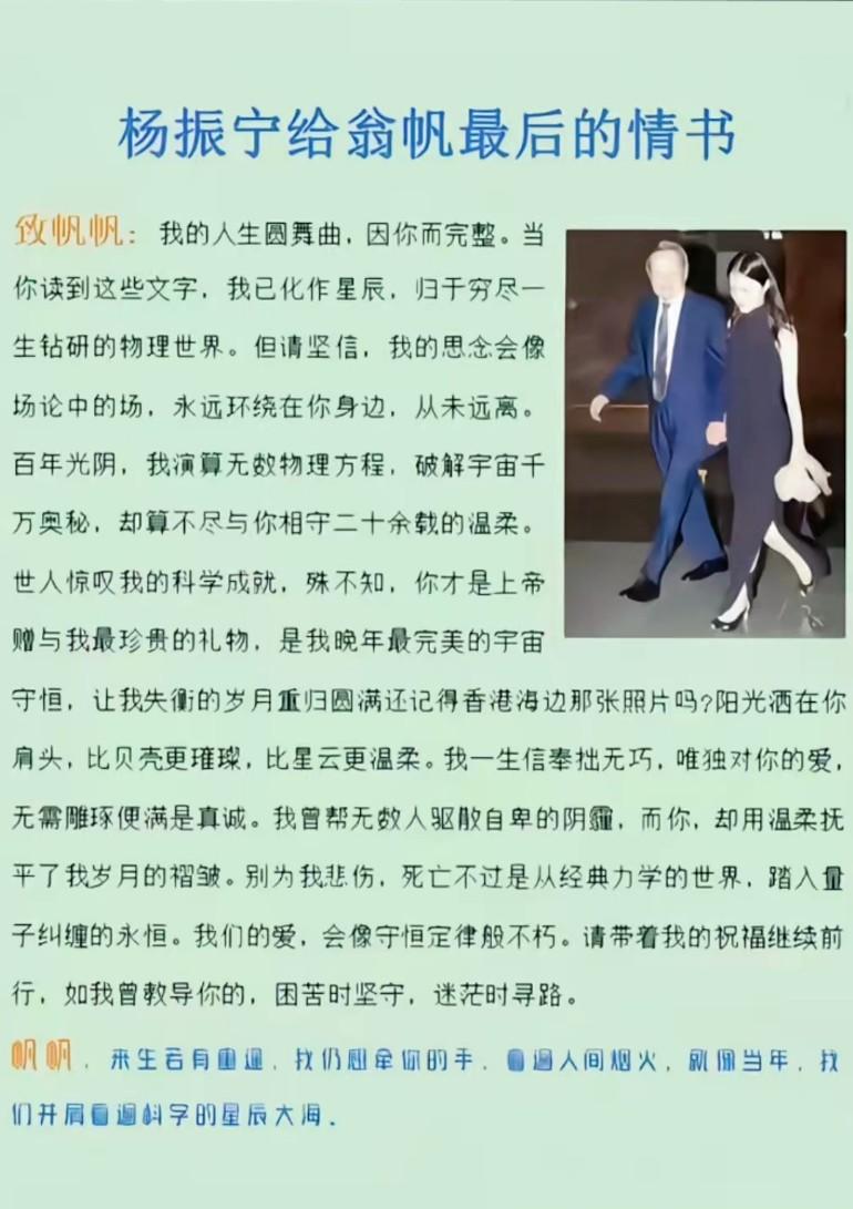 杨振宁给翁帆最后的情书: “当你读到这些文字,我已化作星辰,归干穷尽一生钻研的物理世界,但请坚信,我的思念会像场论中的场,永远环绕在你身边,从未远离” 内心被温柔到了,同时也变得无比坚定而有力量:死亡不过是从经典力学的世界,踏入量子纠缠的永恒!好喜欢的一句话困苦时坚守,迷茫时寻路太经典能激励正在低谷的人走向光芒,有才的物理学家!演算无数物理方程,破解宇宙千万奥秘,却算不尽相守二十余载的温柔!这有多眷恋啊! 一个人位高权重,却无比尊敬他的另一半。像诗一样的情书!人为何要多读书?读书也许不能带给人物质财富,但却能滋养丰富人的精神世界。这就是一束光照亮她的前方,牵着她收手,教她认识格局,给了她一片天的人,怎可能忘的掉,说她幸运可是他离开了带着她的光,说她不幸可他曾经温暖了她的整个世界,人的一生能遇见也是三生有幸