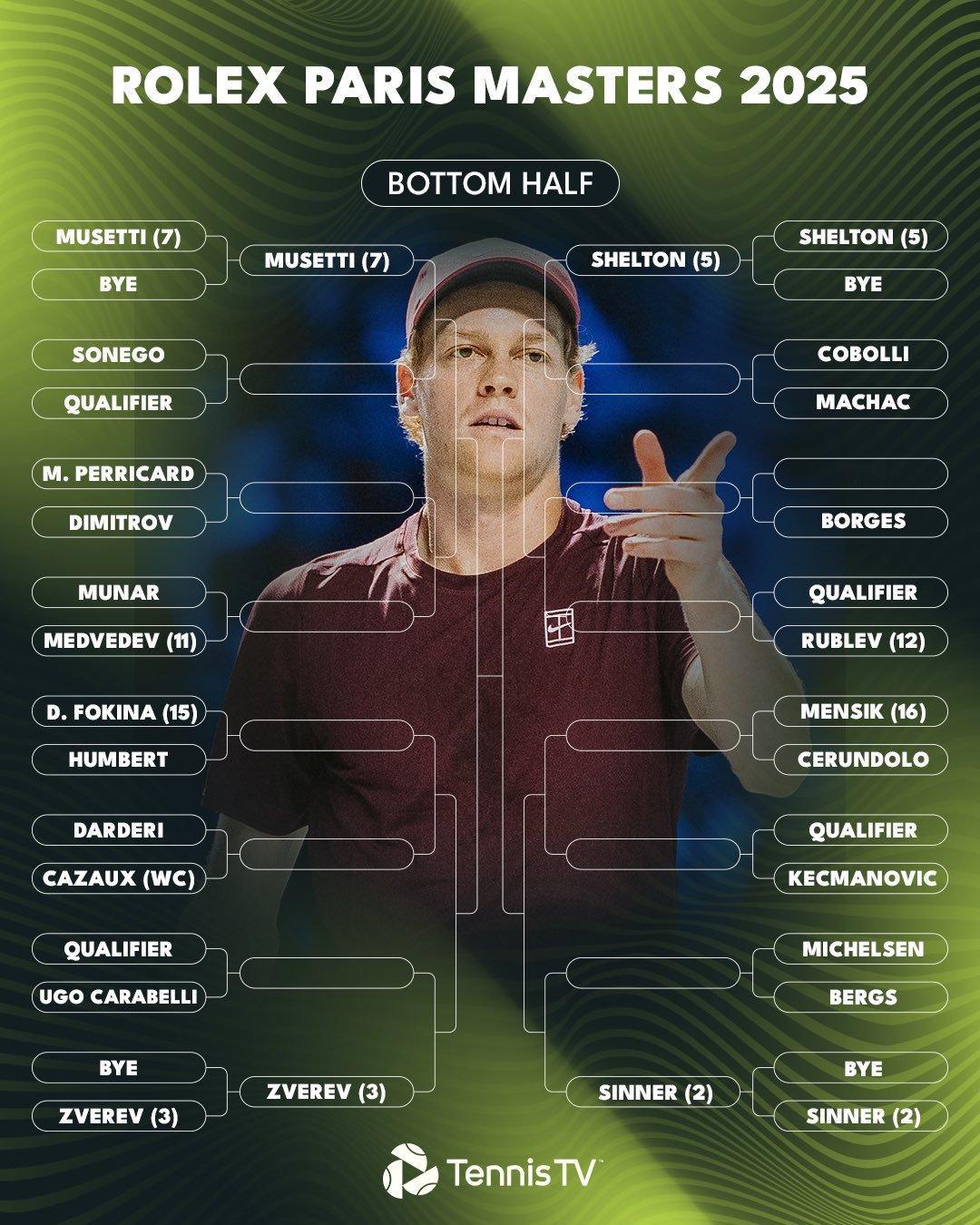 2025年度最后一项ATP大师赛巴黎大师赛公布男单签表,00后双子星阿尔卡拉斯与