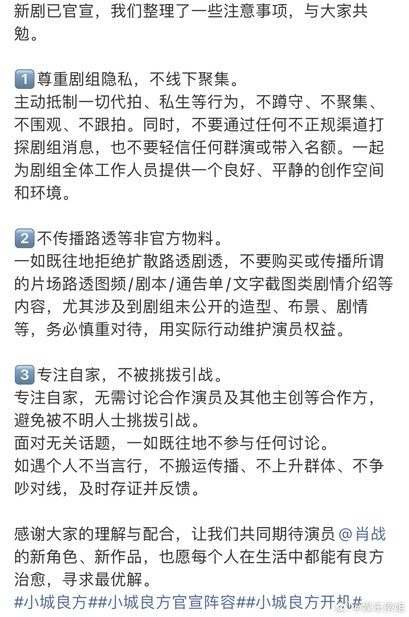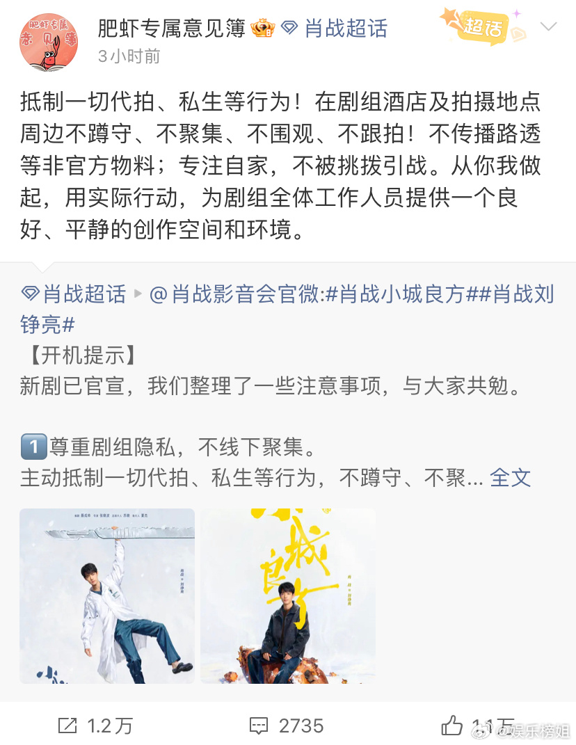 肖战方抵制代拍肖战方呼吁主动抵制一切代拍、私生等行为,不蹲守、不聚集、不围观、不跟拍。感谢大家的理解与配合,让我们共同期待演员肖战的新角色刘铮亮、新作品《小城良方》[打call] 小城良方